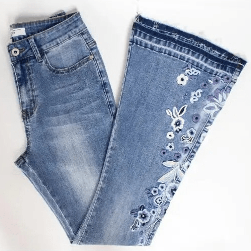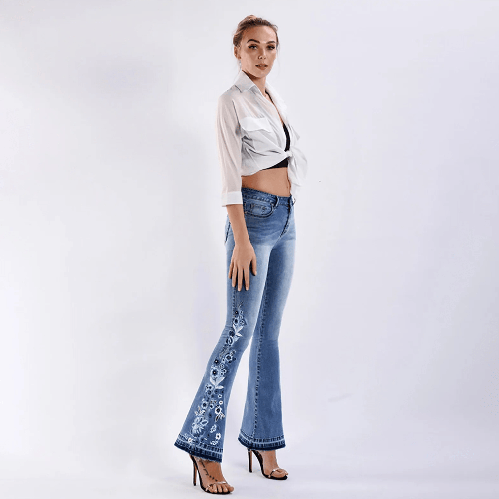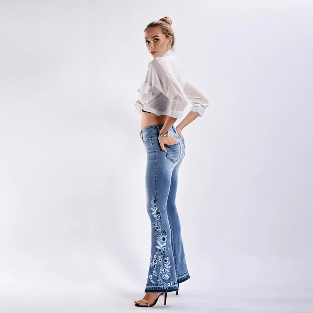 Ge din stil en touch av feminint hantverk med våra ljusblå utsvängda jeans dam med blombroderi – perfekt för dig som älskar detaljer och en smickrande siluett.