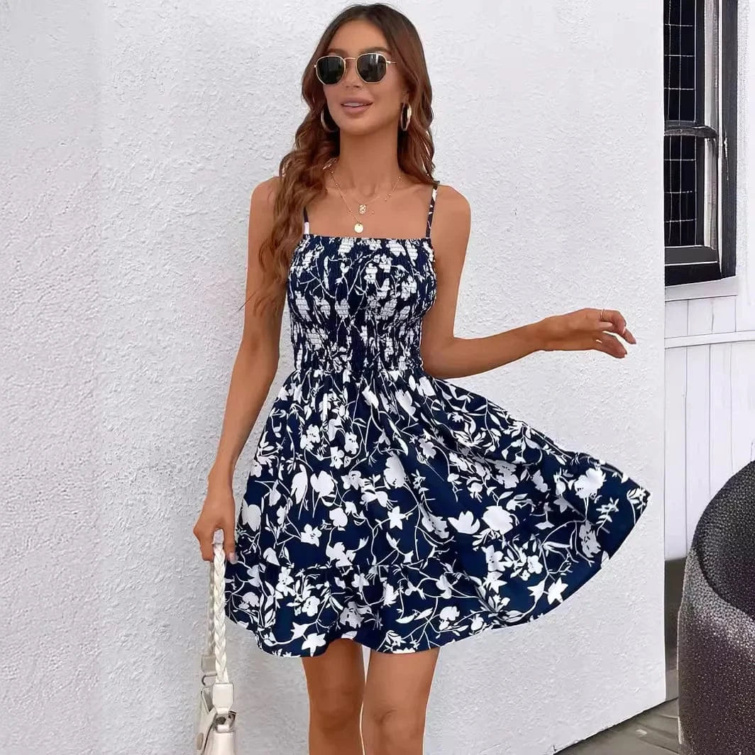 Låt din stil blomstra med denna marinblå klänning med vita blommor. Perfekt för varma vår- och sommardagar när du vill känna dig både bekväm och elegant.