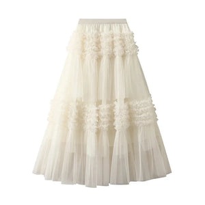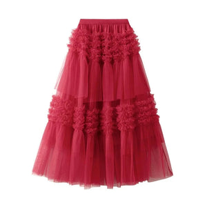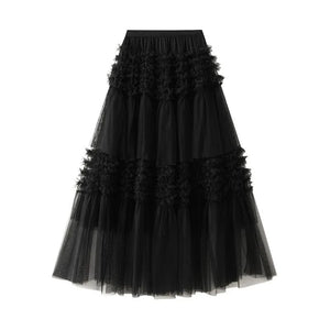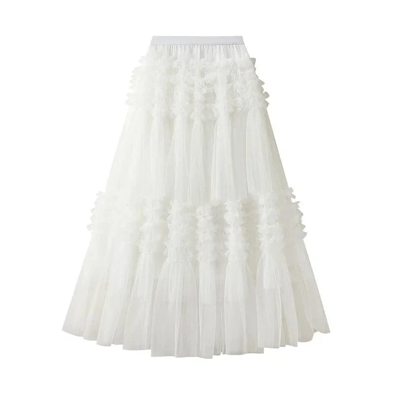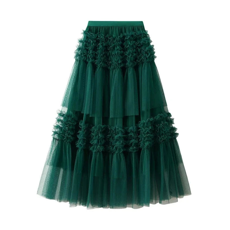 Låt varje steg kännas som en dans när du sveper fram i denna maxikjol med ett moln av rynkade volanger. En romantisk, luftig och ändå varm följeslagare för dina mest minnesvärda dagar.