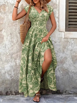 Lyft din sommargarderob med denna underbara maxiklänning. Med sin romantiska blommiga design och eleganta V-ringning är den perfekt för allt från avslappnade stranddagar till festliga sommarkvällar.