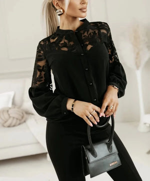 Modern blus med kinakrage och genomskinliga ärmar – stilren elegans för alla tillfällen