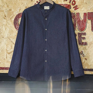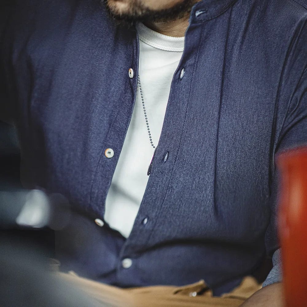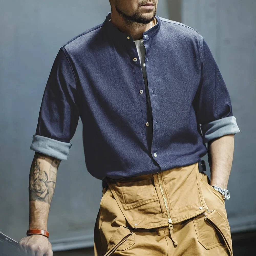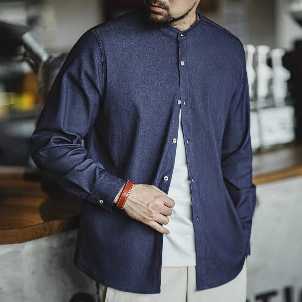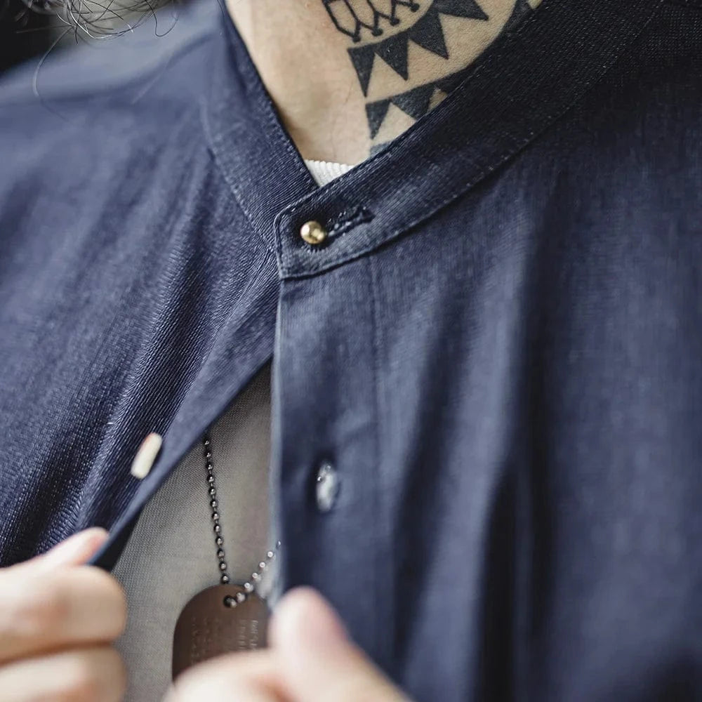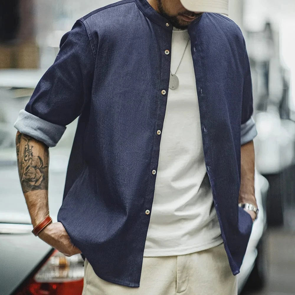 Mörkblå denimskjorta med murarkrage – för dig som älskar tidlös enkelhet med edge