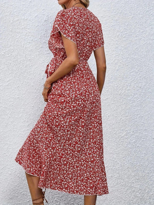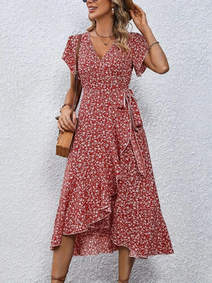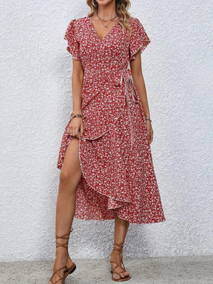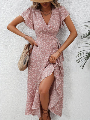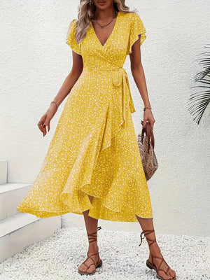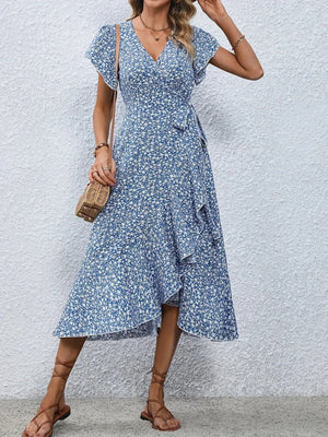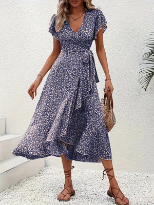 Känn dig fri och elegant i denna omlottklänning med romantiskt blommönster. Perfekt för sommarens äventyr, från picknickar på ängen till kvällar vid strandpromenaden.