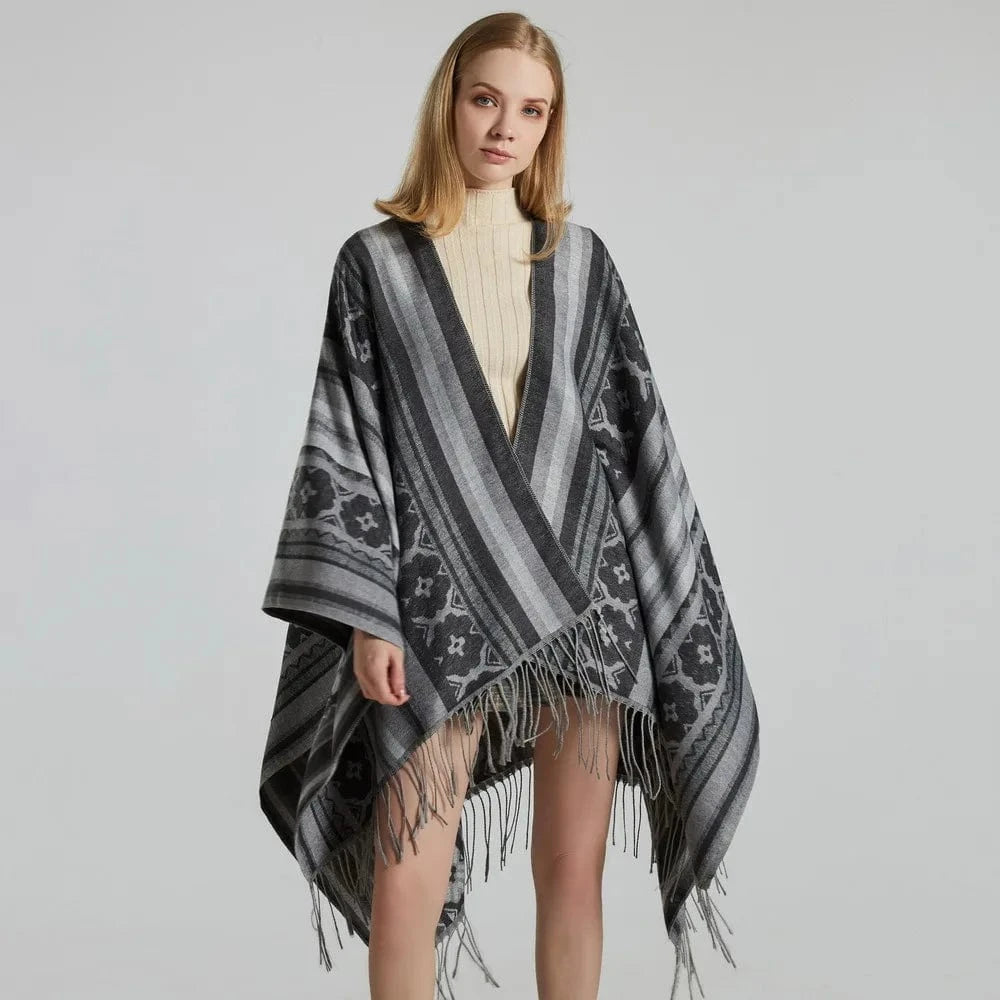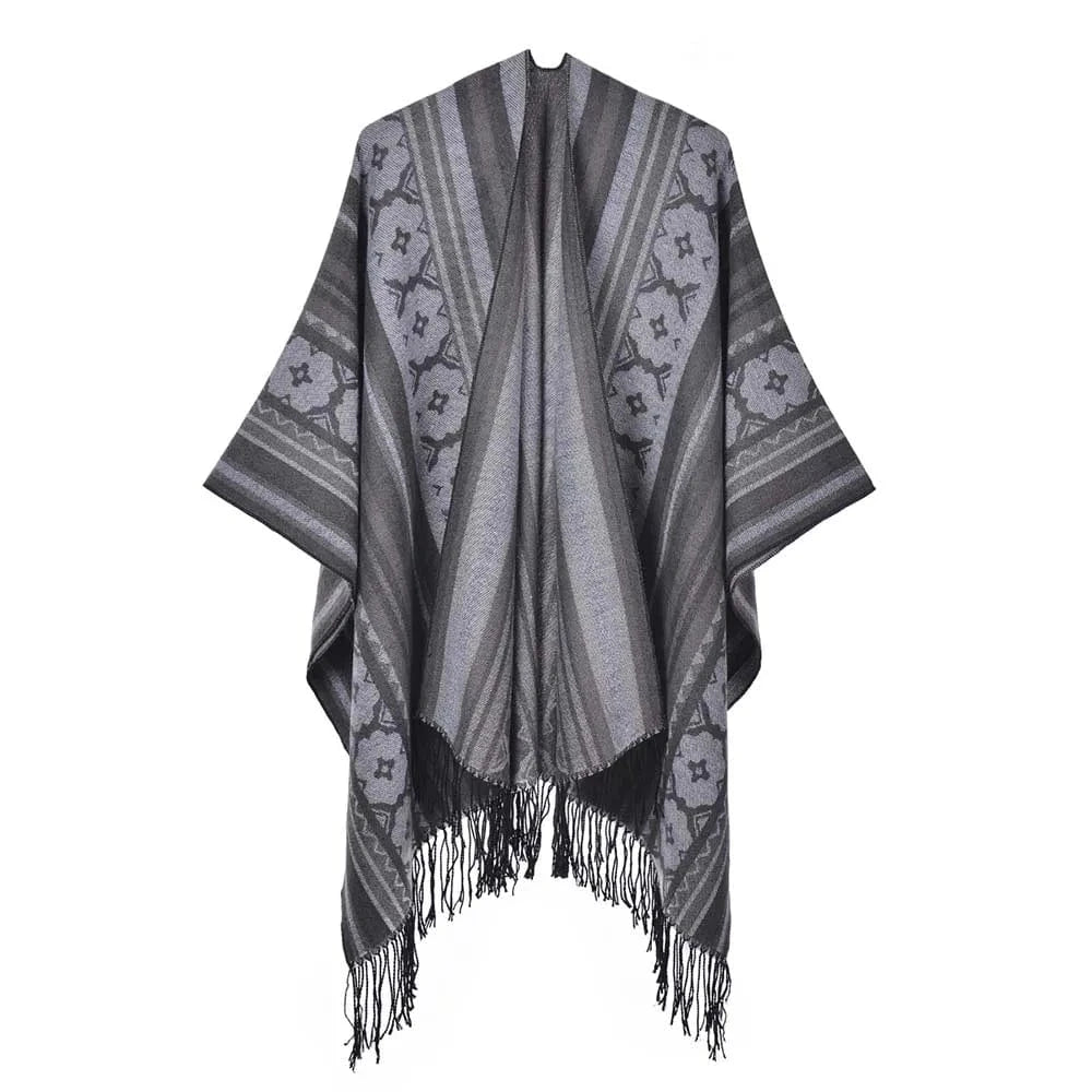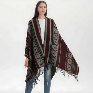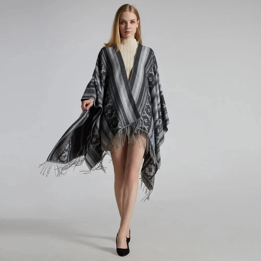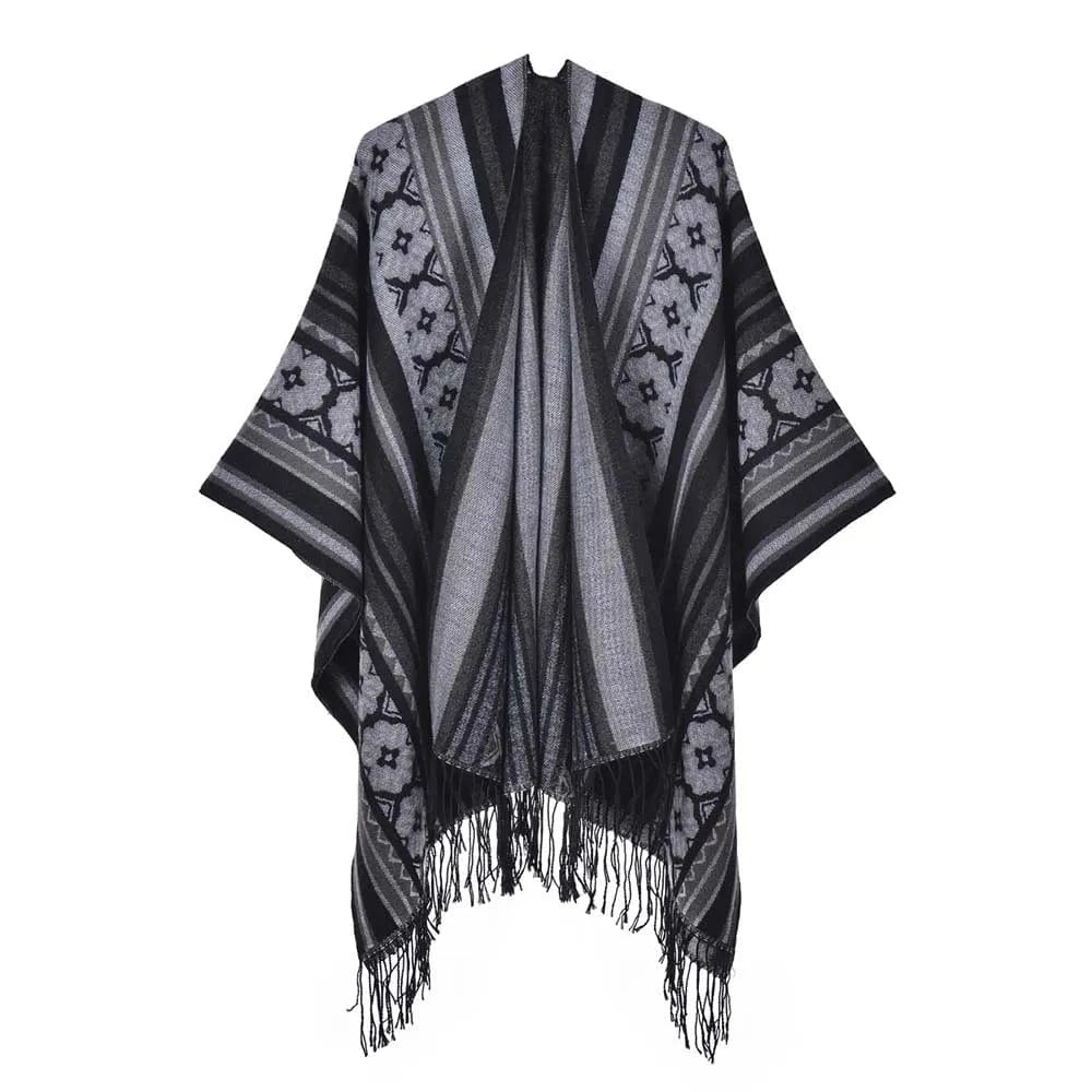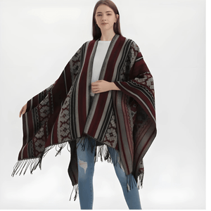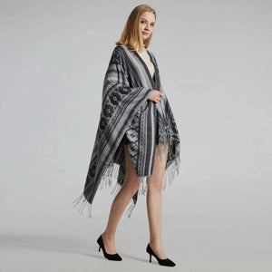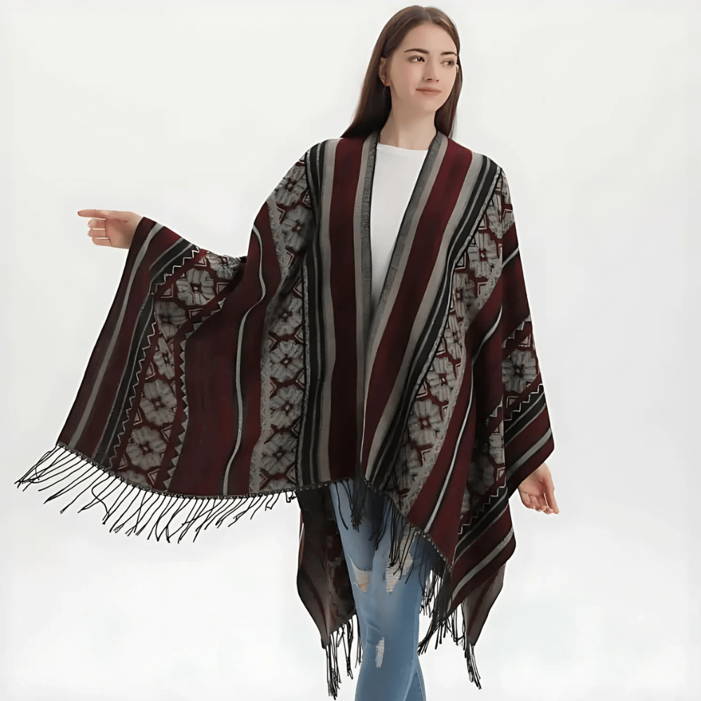 Ge din outfit en fri och elegant touch med vår öppen poncho för dam. Med sitt mjuka fall, klassiska mönster och bohemiska känsla blir den snabbt en favorit oavsett årstid.