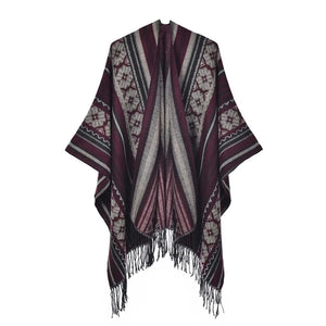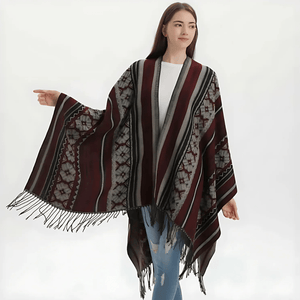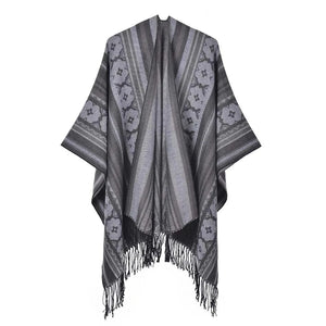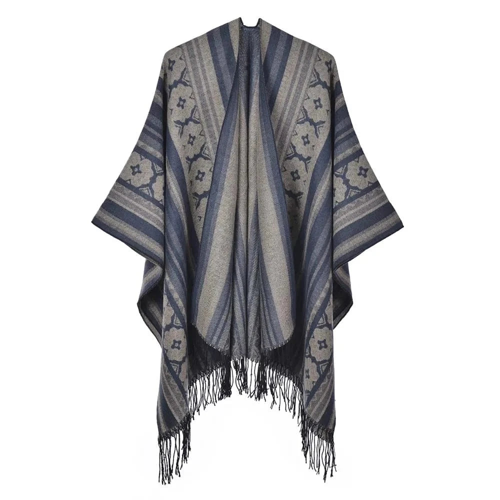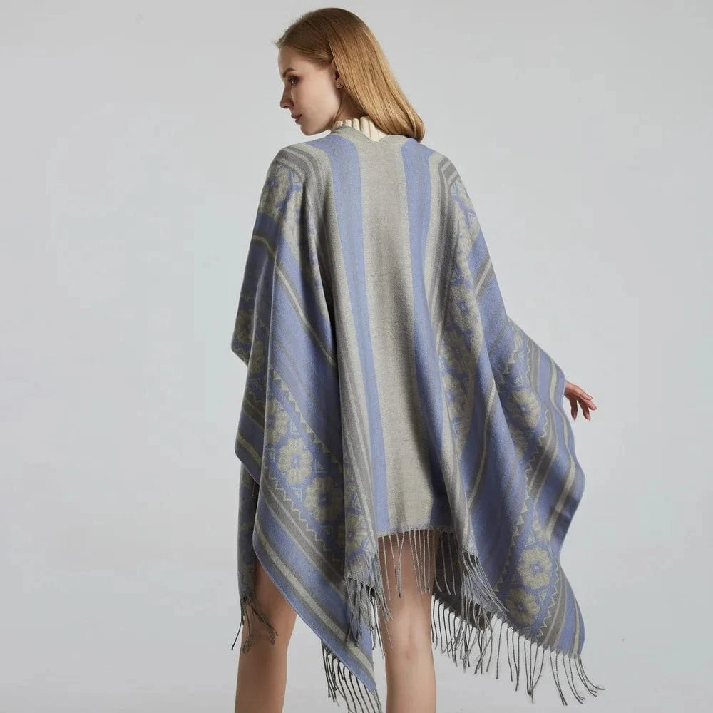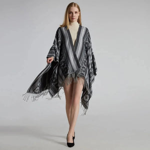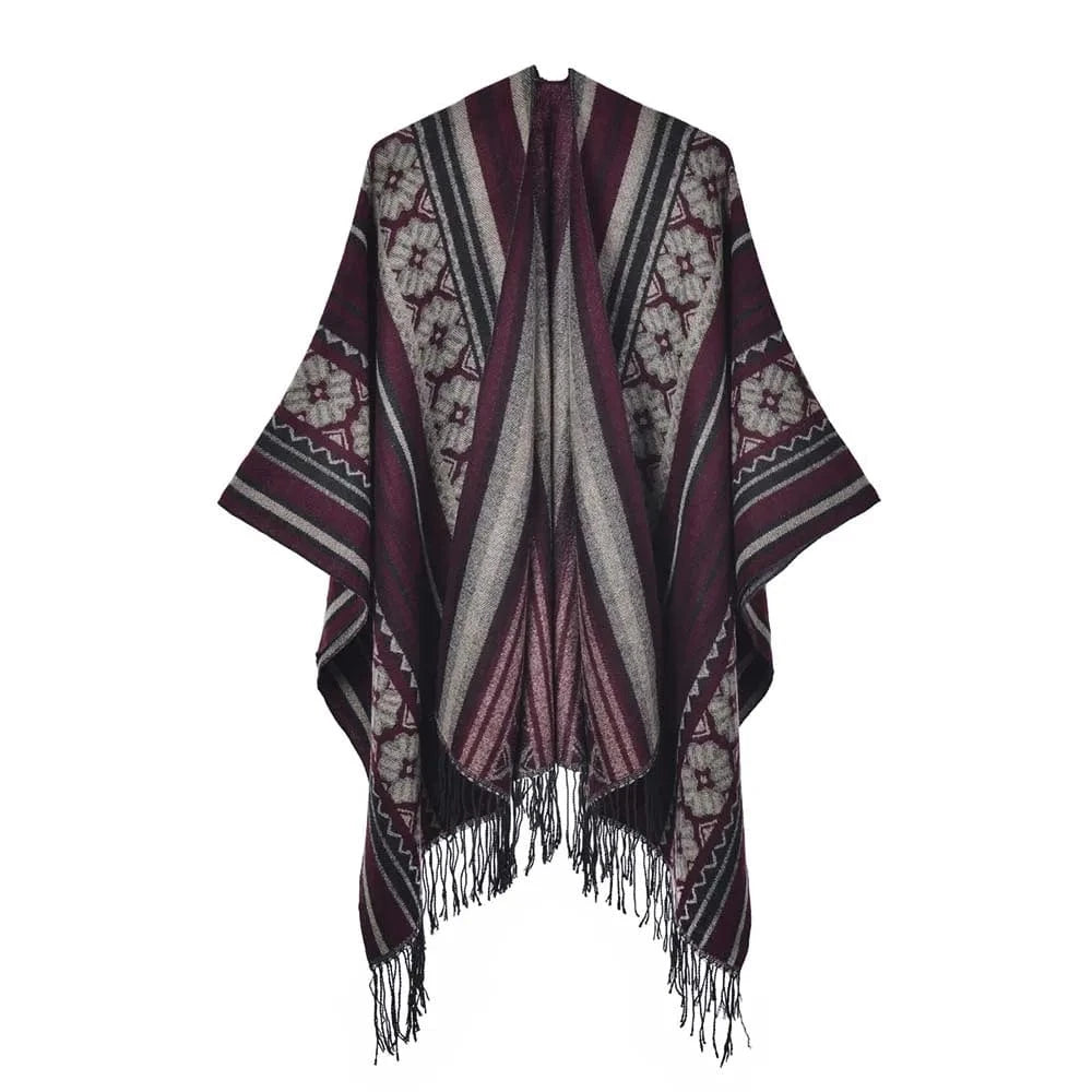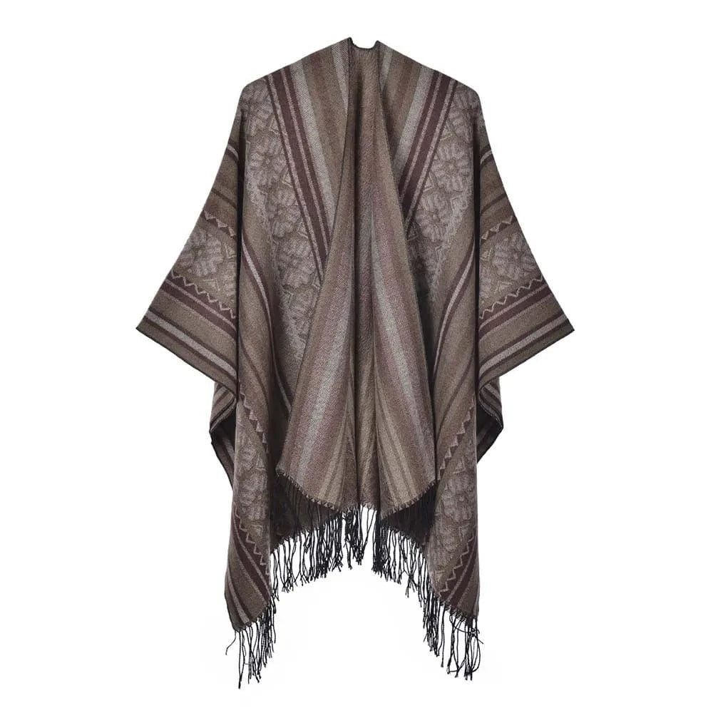 Ge din outfit en fri och elegant touch med vår öppen poncho för dam. Med sitt mjuka fall, klassiska mönster och bohemiska känsla blir den snabbt en favorit oavsett årstid.
