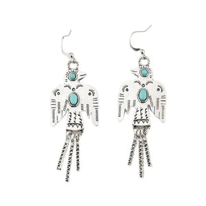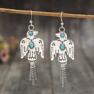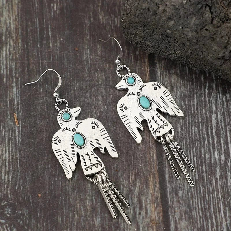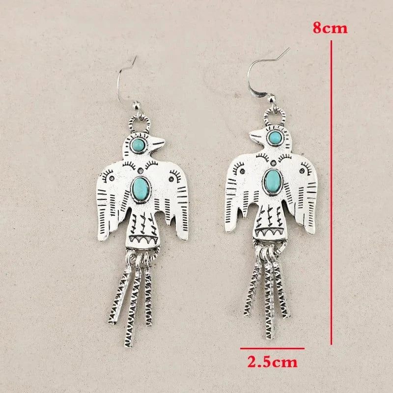 Ge din look en känsla av sydvästlig mystik och bohemisk frihet med dessa unika örhängen i form av den mytiska Thunderbird-fågeln. Med gnistrande turkosa stenar blir de snabbt en statement-accessoar som lyfter varje outfit.