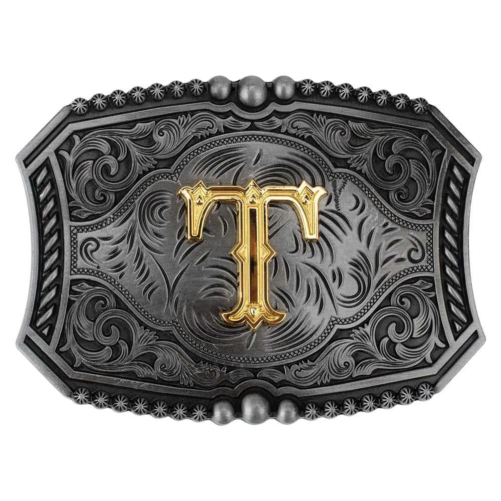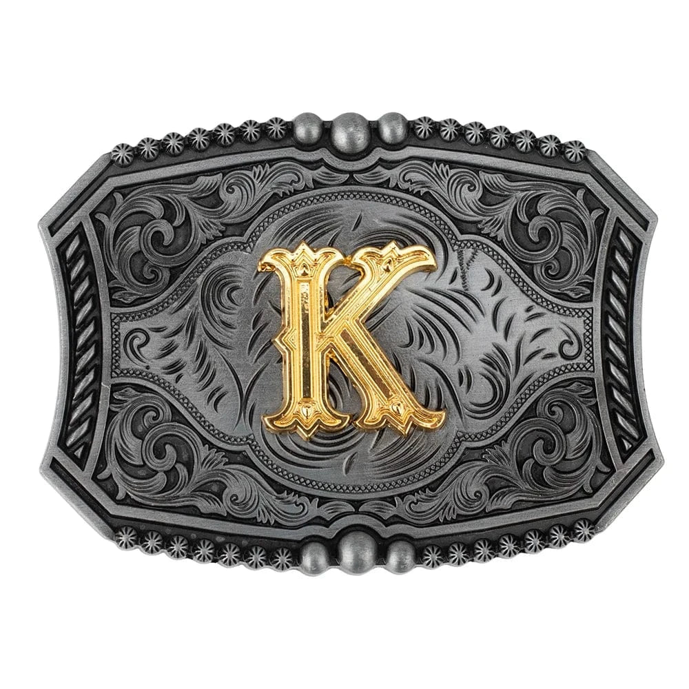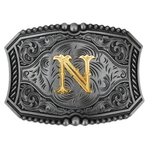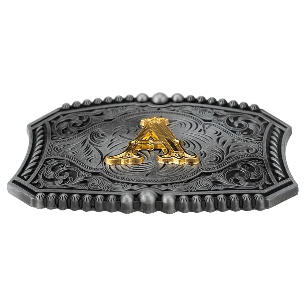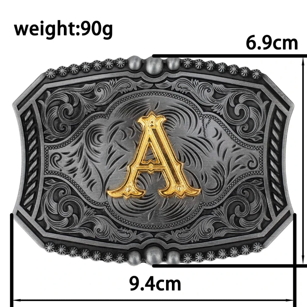Låt din outfit tala med ett bältesspänne som är lika unikt som du. Den gyllene bokstaven på den mörkt graverade bakgrunden förmedlar både styrka och stil – en perfekt balans mellan personlig touch och klassisk westernkänsla.