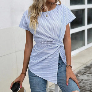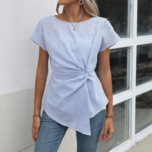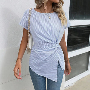 Skapa en elegant men avslappnad look med denna randiga blus med knyt. Det asymmetriska knytet framtill ger en smickrande silhuett och gör denna blus till en självklar favorit för både vardag och mer dressade tillfällen.
