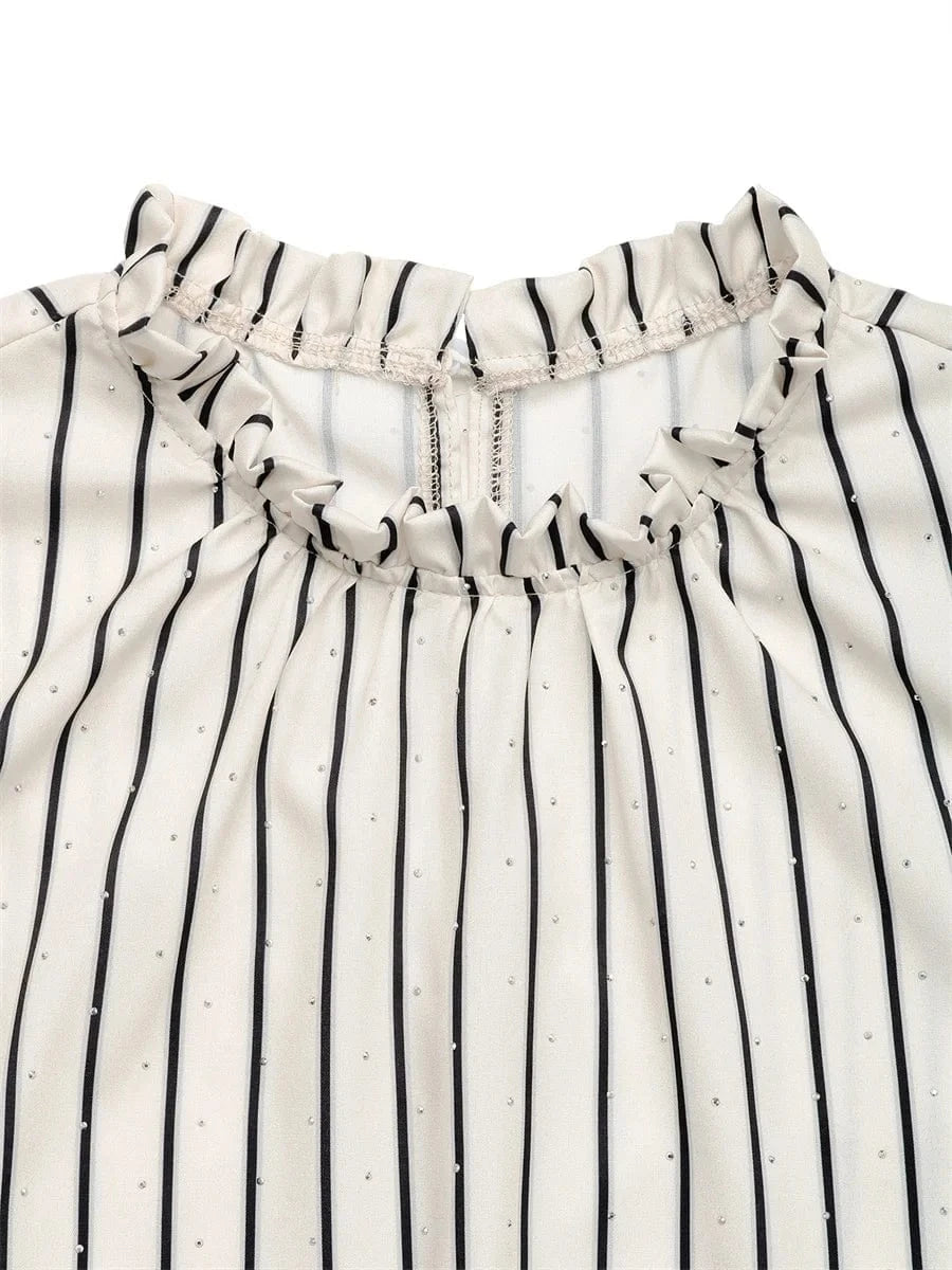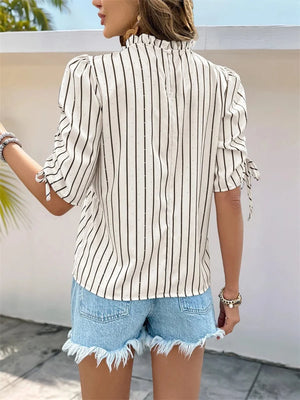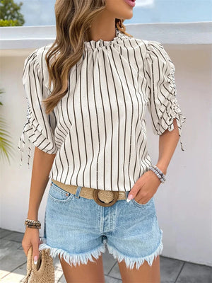 Fånga sommarens lätta känsla med denna randiga blus. Med sin avslappnade passform och subtila volangdetaljer är den både chic och bekväm – perfekt för soliga dagar och varma kvällar.