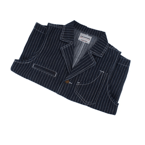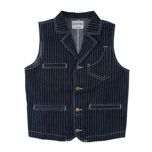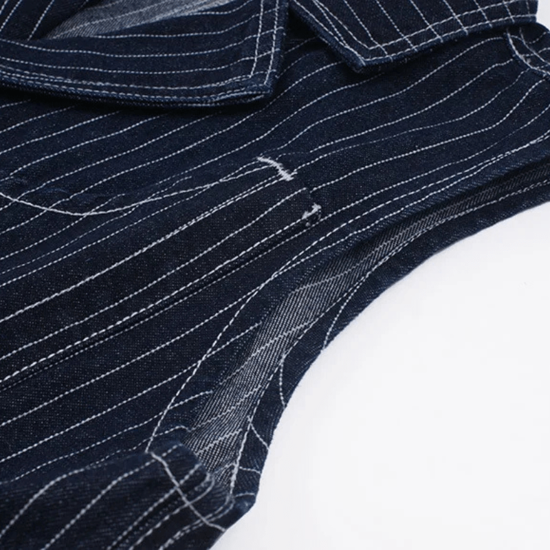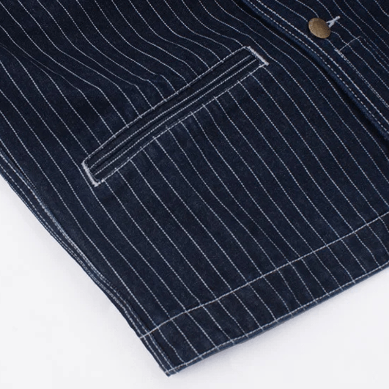 Den här randiga denimvästen är mer än bara ett lager över din skjorta – den är en bro mellan klassiskt arbete och modern western-estetik. Med sina tydliga vertikala ränder och smarta fickor ger den dig en stil som känns lika hemma på prärien som i stadens gator.