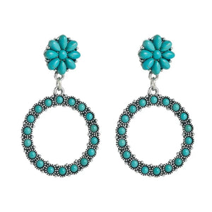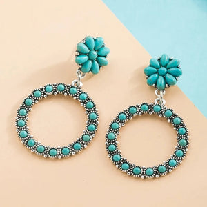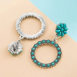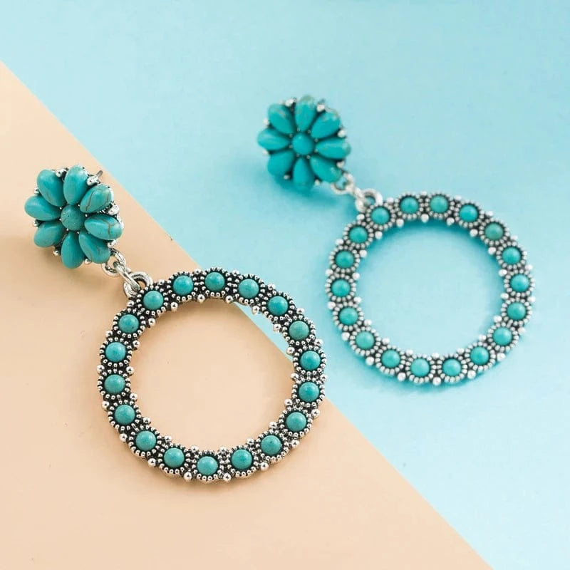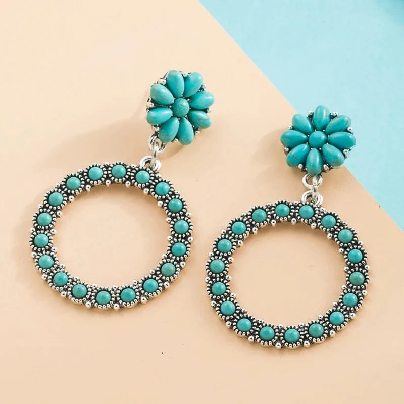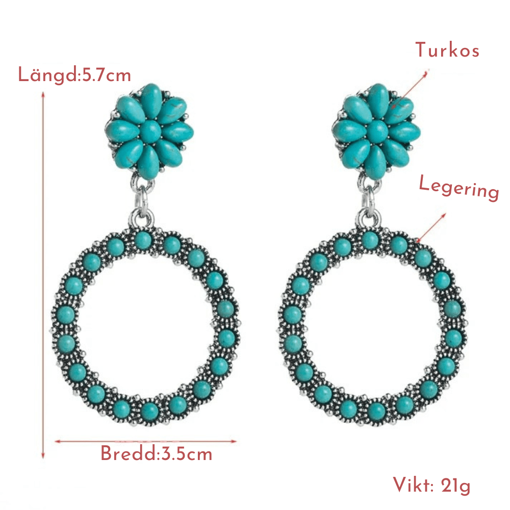 Ett par iögonfallande ringörhängen där turkosa “blommor” möter antiksilver. De är lätta att styla – från boots och denim till sidenblus – och ger varje look en subtil Western-twist.