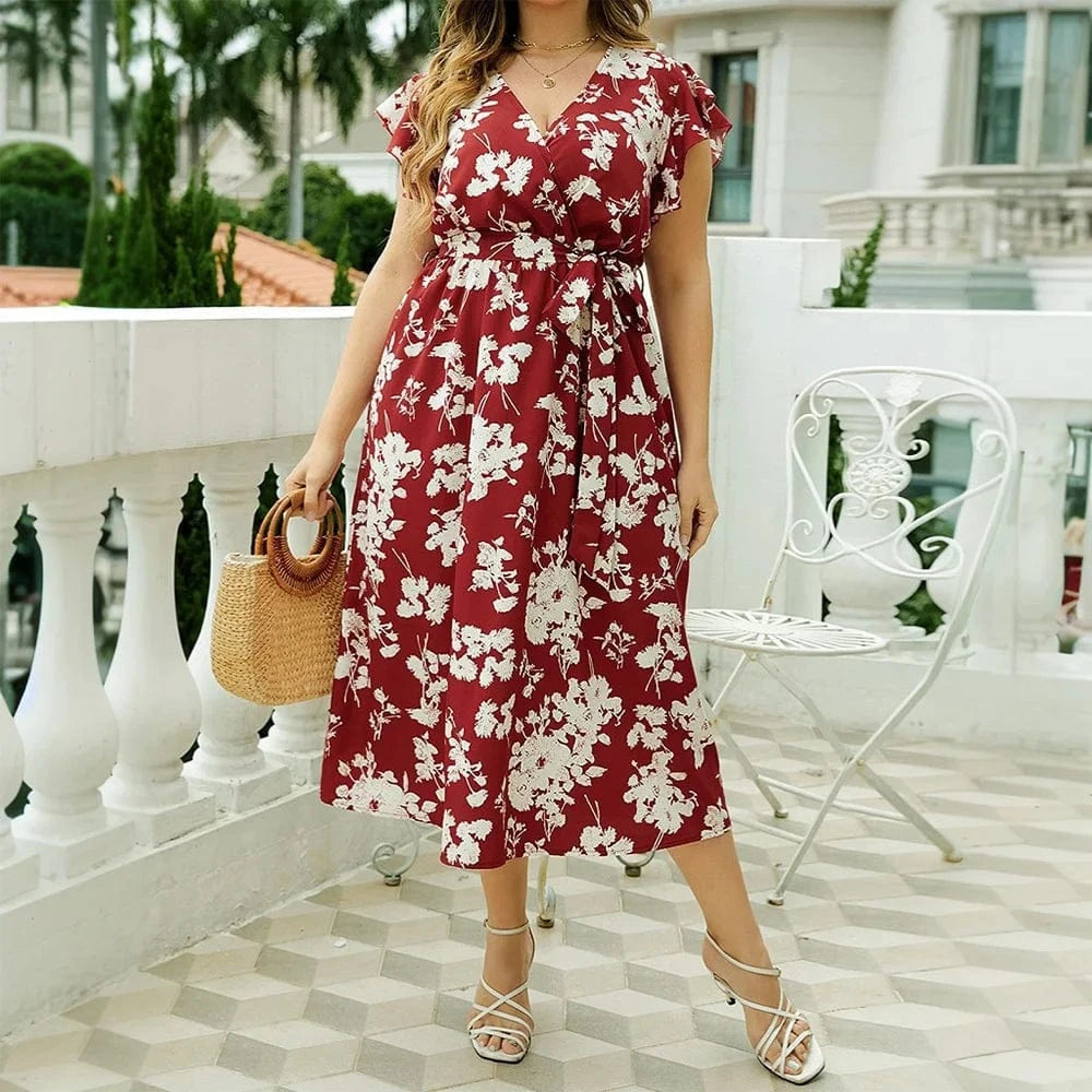Skapa en avslappnad men elegant look med denna röda blommiga klänning i plus size. Perfekt för varma sommardagar, semesterresor eller en picknick i parken.