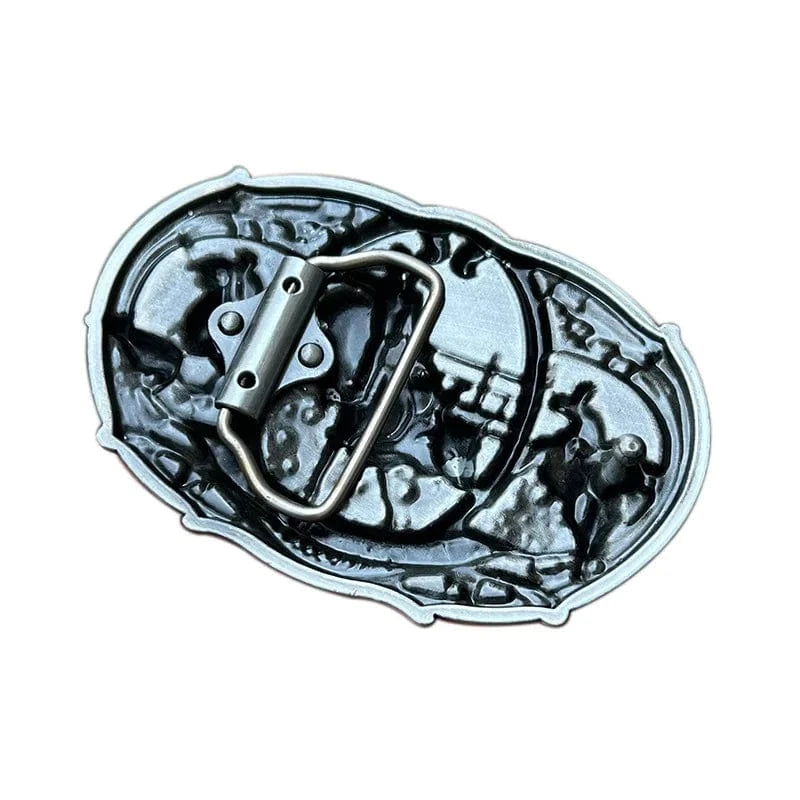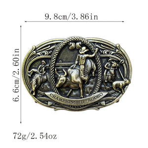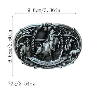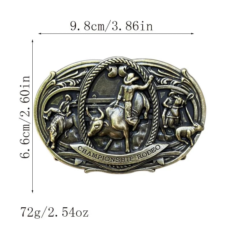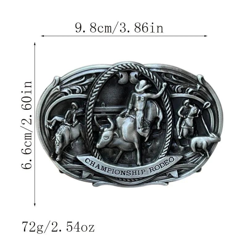 Känn adrenalinet från rodeons värld varje gång du sätter på dig detta ikoniska bältespänne. Ett mästerligt hantverk som fångar cowboyens mod och tjurens styrka i en tidlös metallscen.