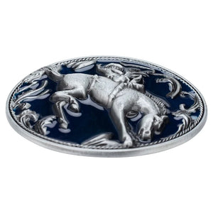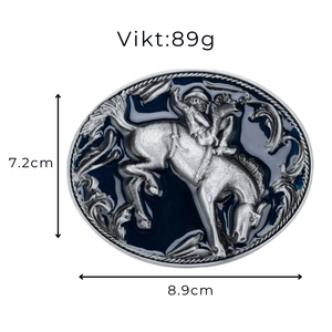 Lyft fram din vilda sida med detta Rodeo Ryttare Bältesspänne Blå Emalj. En kraftfull accessoar som kombinerar traditionell western-estetik med konstnärliga detaljer i silverton och djupblå emalj.