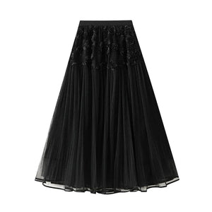 Romantisk midikjol i plisserad tyll med en bård av handgjorda rosor