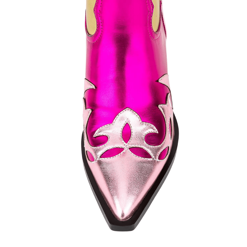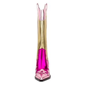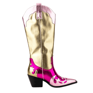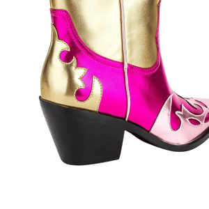 Dessa stövlar är inte bara skor – de är en upplevelse. Med sin djärva kombination av rosé, guld och metallictoner blir de snabbt huvudrollen i varje outfit. Perfekta för dig som älskar att sticka ut, dansa hela natten och omfamna din inre cowgirl med stil och självförtroende.