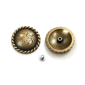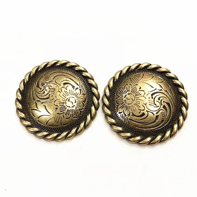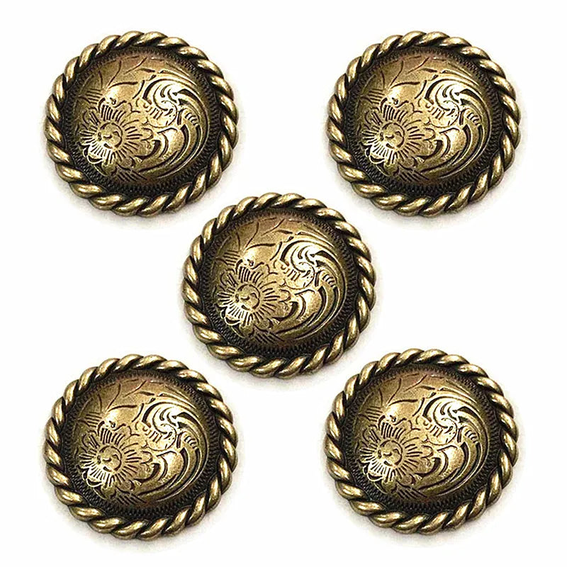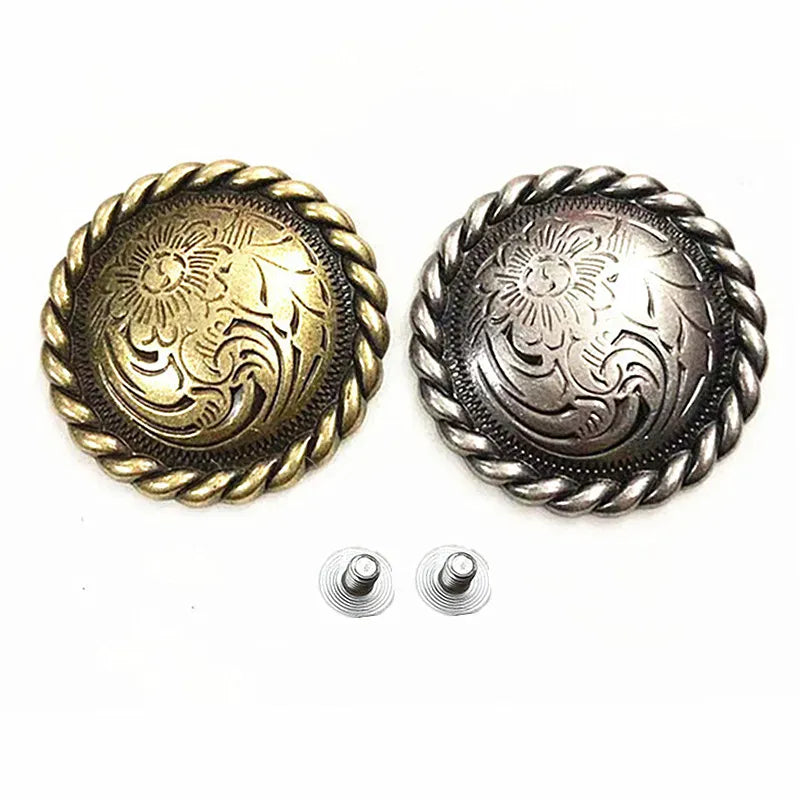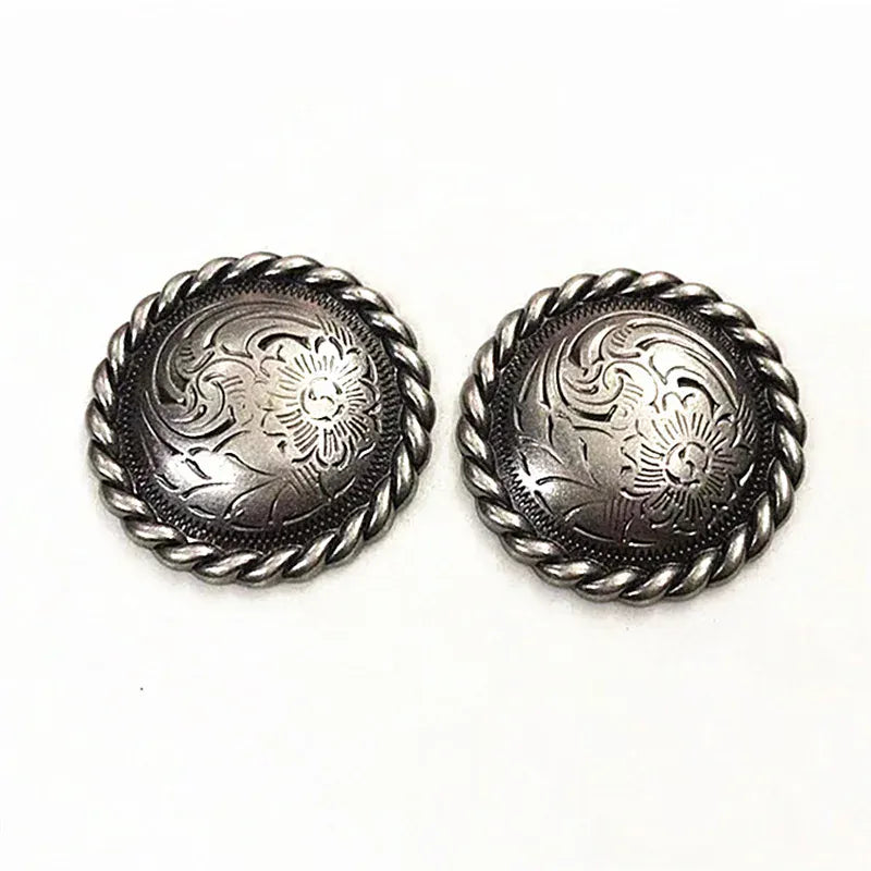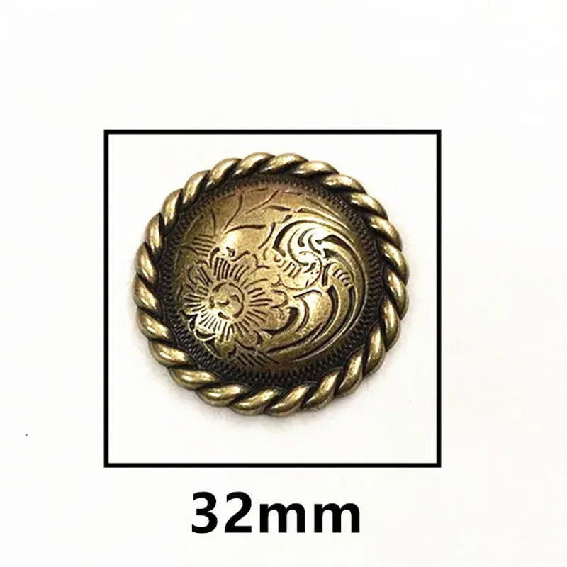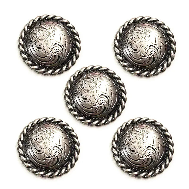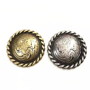 Låt din outfit få den där genuina westernkänslan med vår runda concho med vackert djup blomgravyr. Ett tidlöst smycke för läder, väskor, hattar eller boots — och perfekt när du vill ge din stil mer karaktär, tyngd och elegans. Den robusta metallkänslan och den detaljerade ytan gör att du direkt känner kvaliteten i handen.