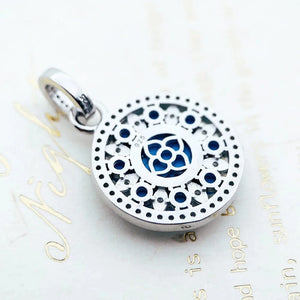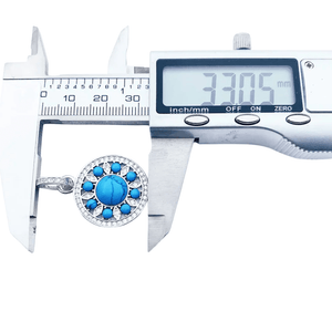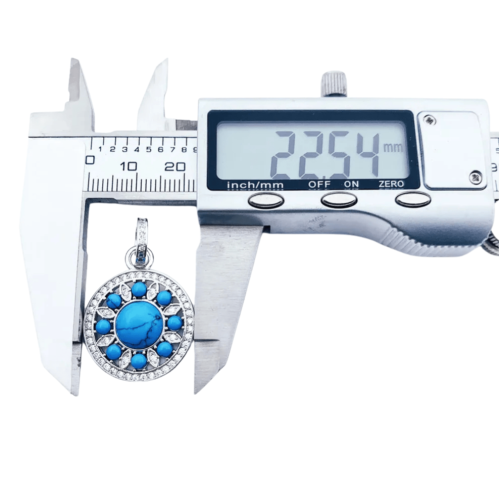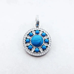 Fånga ljuset och blickarna med denna runda berlock i äkta silver. Den turkosa stenen i centrum omges av strålande strass och skapar en design som både är klassisk och trendig – perfekt för att förstärka din personliga look.