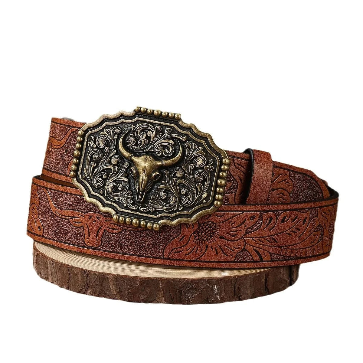 Rustikt cowboybälte i präglat läder med Tjurhuvud-Spänne