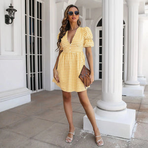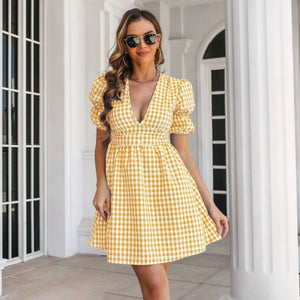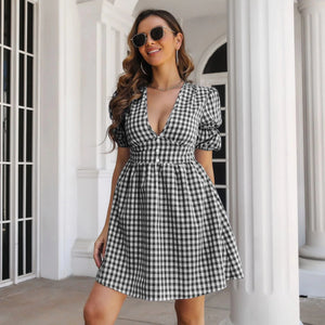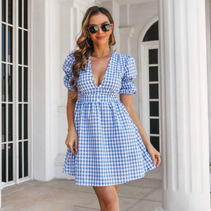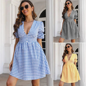 Upplev en perfekt kombination av elegans och bekvämlighet med vår rutiga damklänning. Det lätta materialet och den lekfulla designen gör den till ett självklart val för både vardag och fest i sommar.