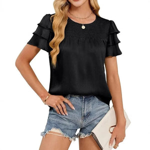 Denna satinblus är skapad för att ge dig en chic och luftig känsla under vårens och sommarens varma dagar. Med sina mjuka volangärmar och lätta satintyg blir den ett självklart val för både vardag och fest.