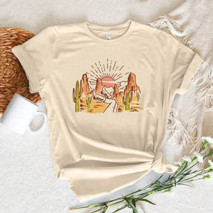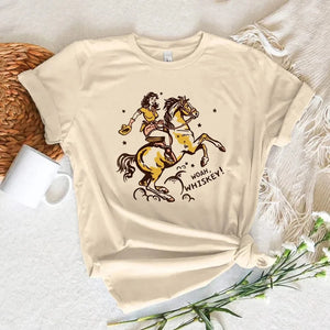 Låt din outfit tala för sig själv med denna charmiga och lekfulla t-shirt. Perfekt för dig som älskar westernstilen och vill bära en touch av frihet och äventyr varje dag.
