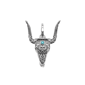 Låt din stil tala för sig själv med detta ikoniska silverhänge, där rå kraft möter elegant hantverk. Den detaljerade tjurskallen pryds av en turkos sten som ger smycket en mystisk och jordnära känsla.