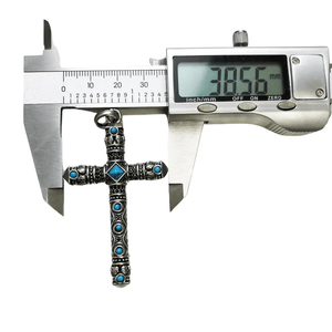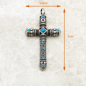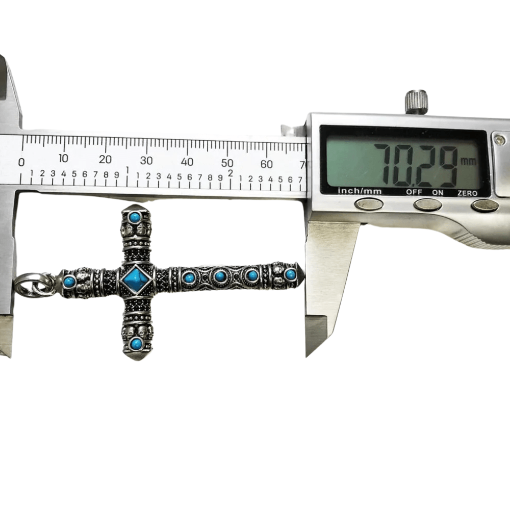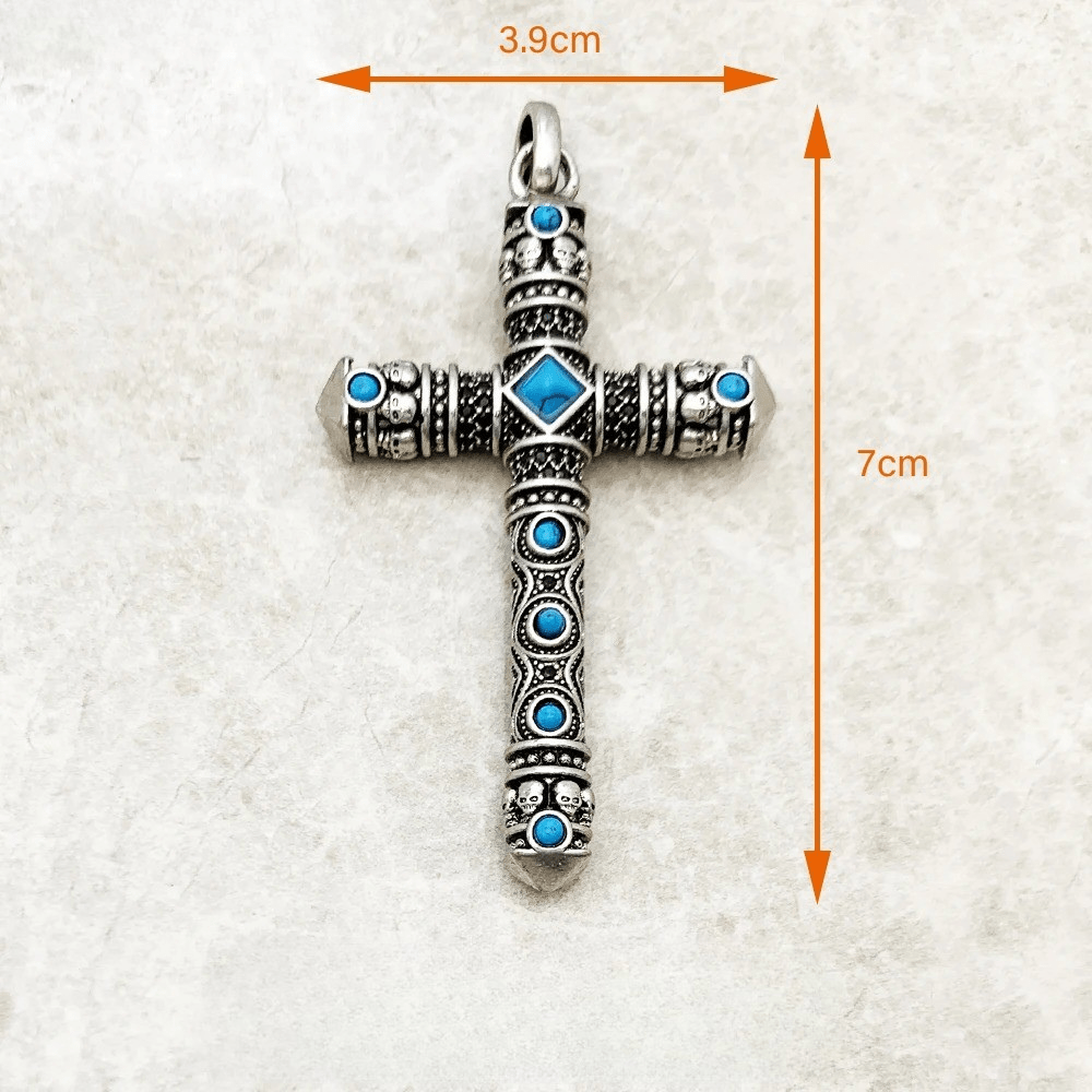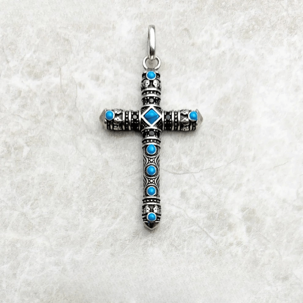 Det här massiva korset i äkta silver kombinerar västerländsk symbolik med en edgy twist. Dekorerat med turkosa stenar och små dödskallemotiv är det ett smycke som inte bara bärs – det förkunnar din personliga stil och styrka.