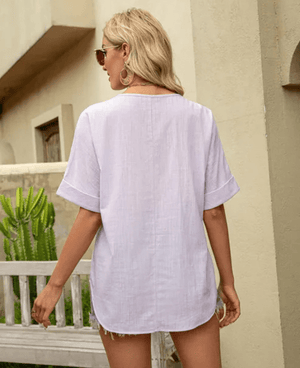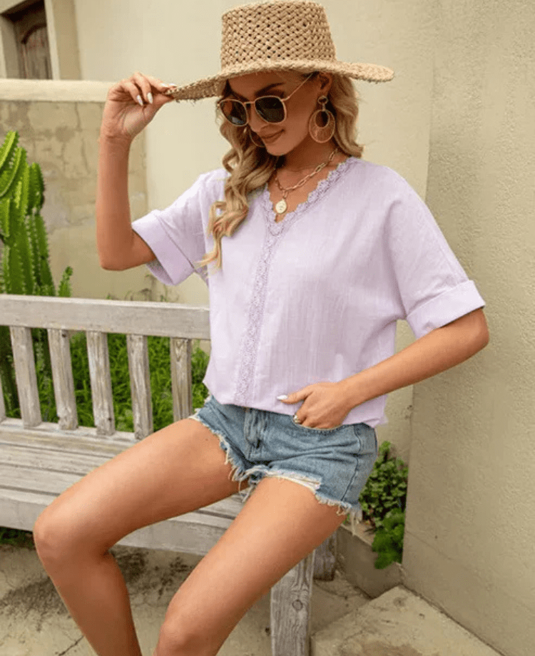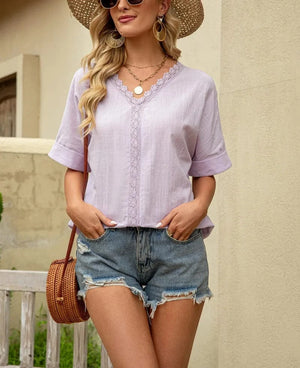 Skapa en romantisk och avslappnad look med denna blus i mjukt tyg och fina spetsdetaljer. Perfekt för sommaren, med v-ringning och korta ärmar som ger både komfort och stil.