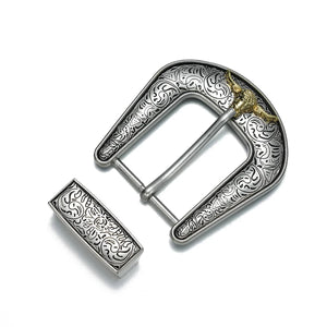 Lyft fram din westernlook med en sofistikerad spännesats i silver. Detaljerad gravyr och klassisk design gör att ditt bälte blir en tidlös statement-accessoar.