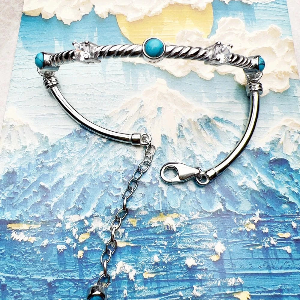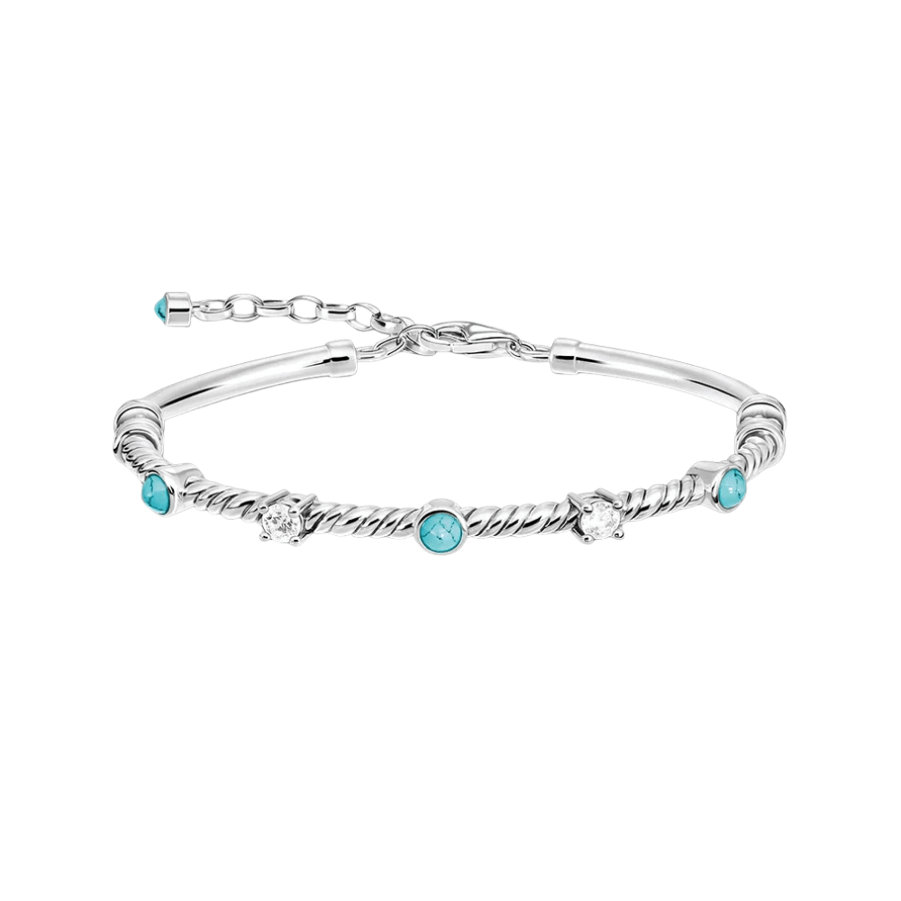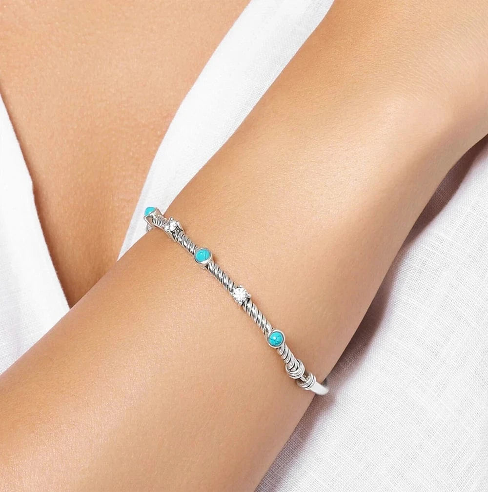 Låt ditt smycke spegla din personlighet. Detta vridna armband i äkta silver pryds av turkosblå stenar och skimrande vita inslag – en kombination som utstrålar både vintagecharm och modern elegans. Perfekt för dig som vill bära något unikt med en känsla av frihet.