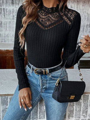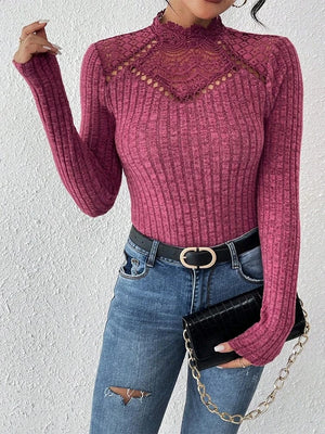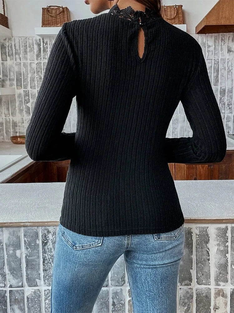 Förhöj din stil med denna stickade blus som kombinerar mjuk komfort med delikata spetsdetaljer. Med hög krage, lång ärm och figurnära passform är den det ultimata plagget för både kontor och kvällsutflykter.