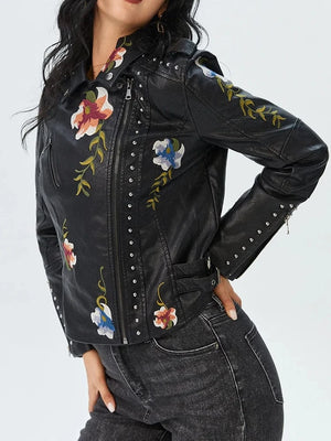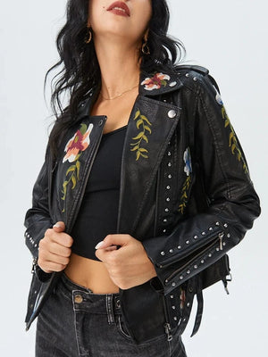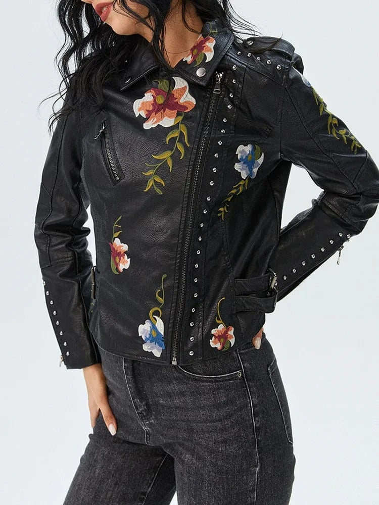 Svart bikerjacka med broderi och nitar – gör din look oförglömlig