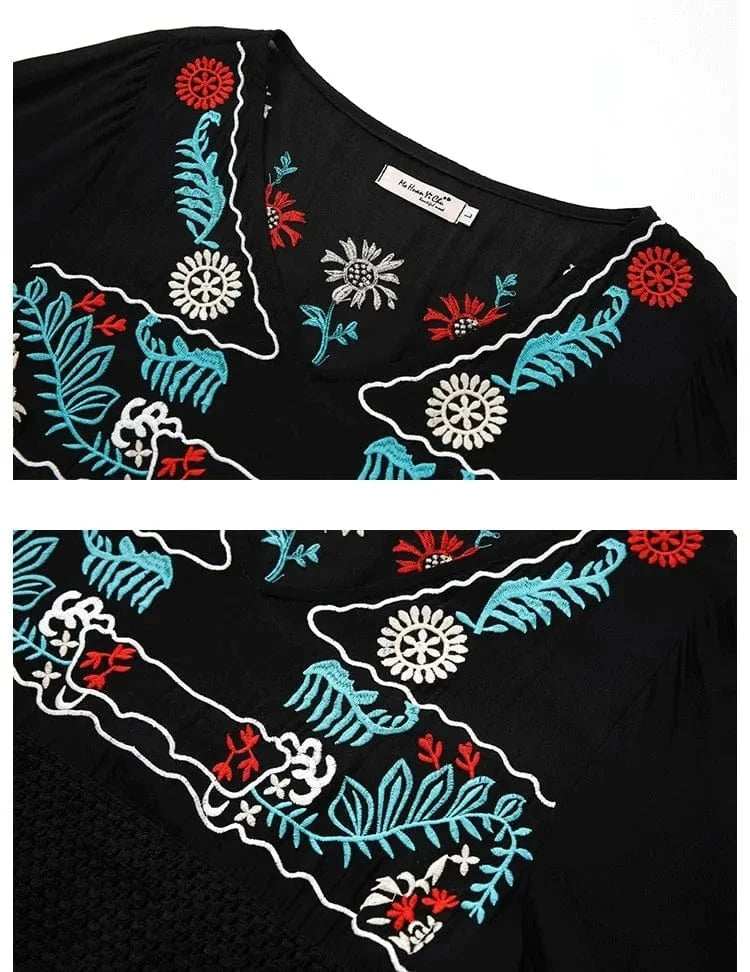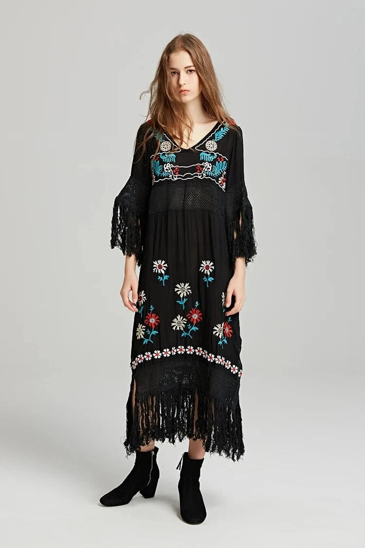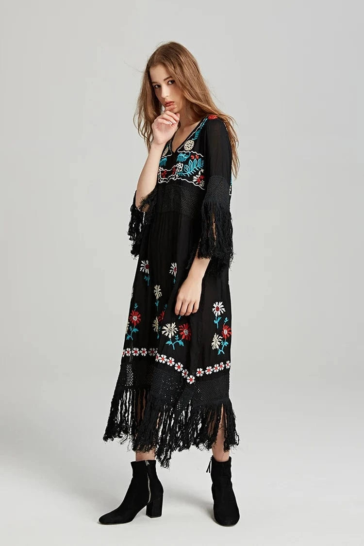 Upplev en perfekt kombination av rörelse och stil med vår svarta klänning med fransar och broderi. Ett unikt plagg som andas frihet och förvandlar varje steg du tar till en dans.