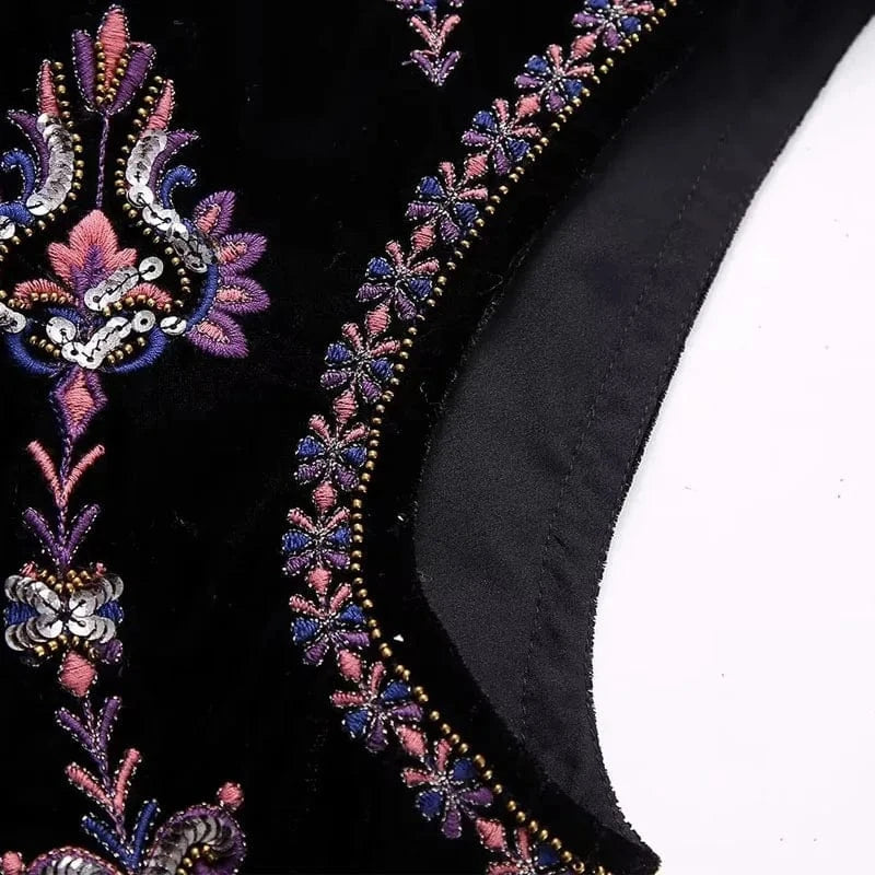 Svart Sammetsväst med Rosa Lila Silver Paljetter Broderi