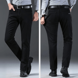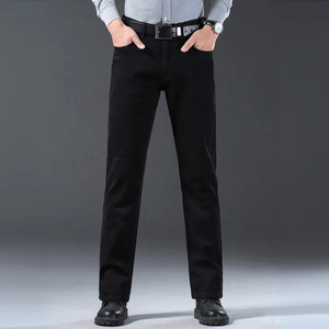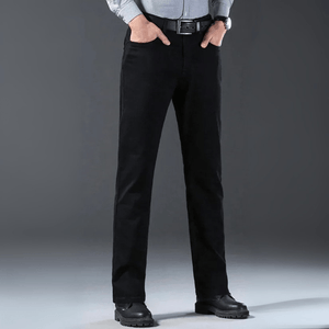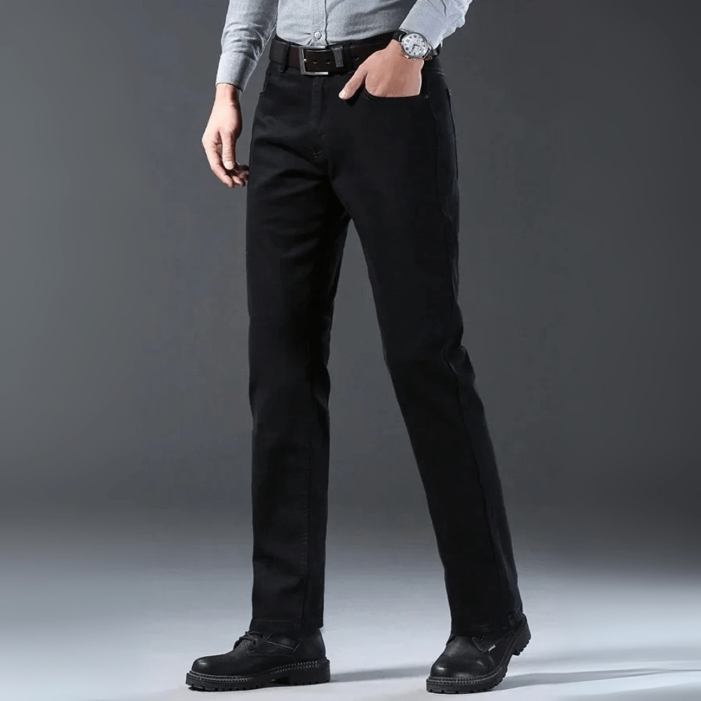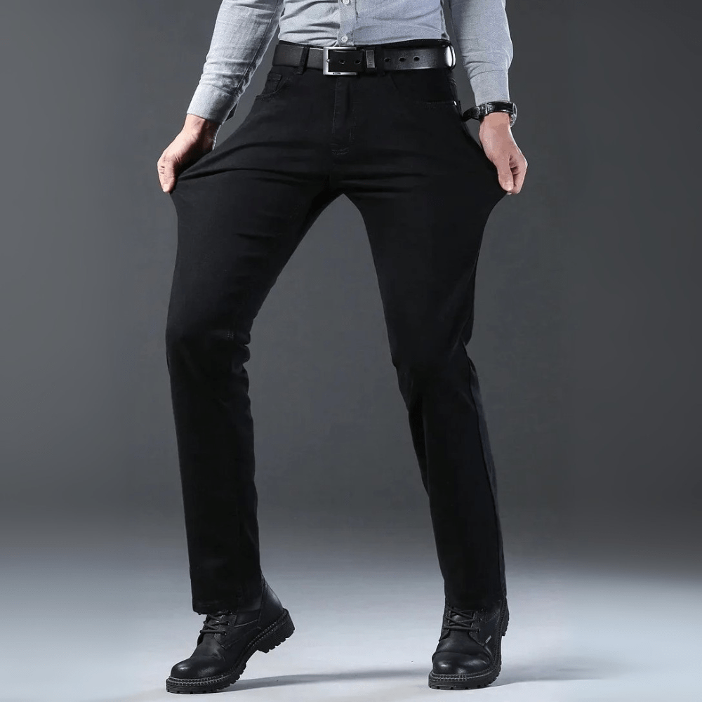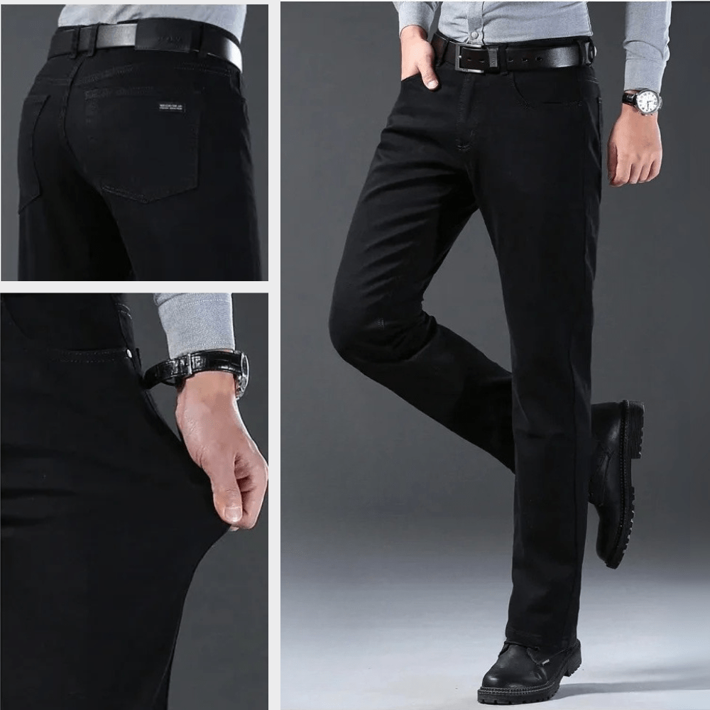 Lyft din vardags- och arbetsgarderob med dessa klassiska svarta jeans för herr. Den raka modellen kombinerar elegans och praktisk komfort – perfekta för både affärsmöten och avslappnade stunder.