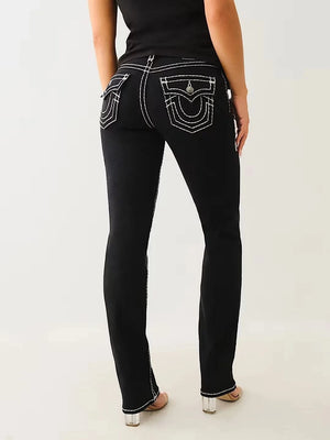 Dessa svarta raka jeans med kontrastsömmar och broderade detaljer är designade för dig som vill ha både komfort och karaktär – varje dag.