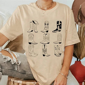 Låt din outfit tala för sig själv med denna charmiga T-shirt som hyllar den fria cowgirl-andan. En mjuk bomullströja med lekfulla illustrationer av boots och hattar – perfekt för dig som älskar westernstilen men vill bära den på ett avslappnat sätt.