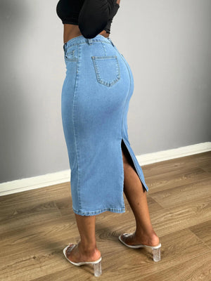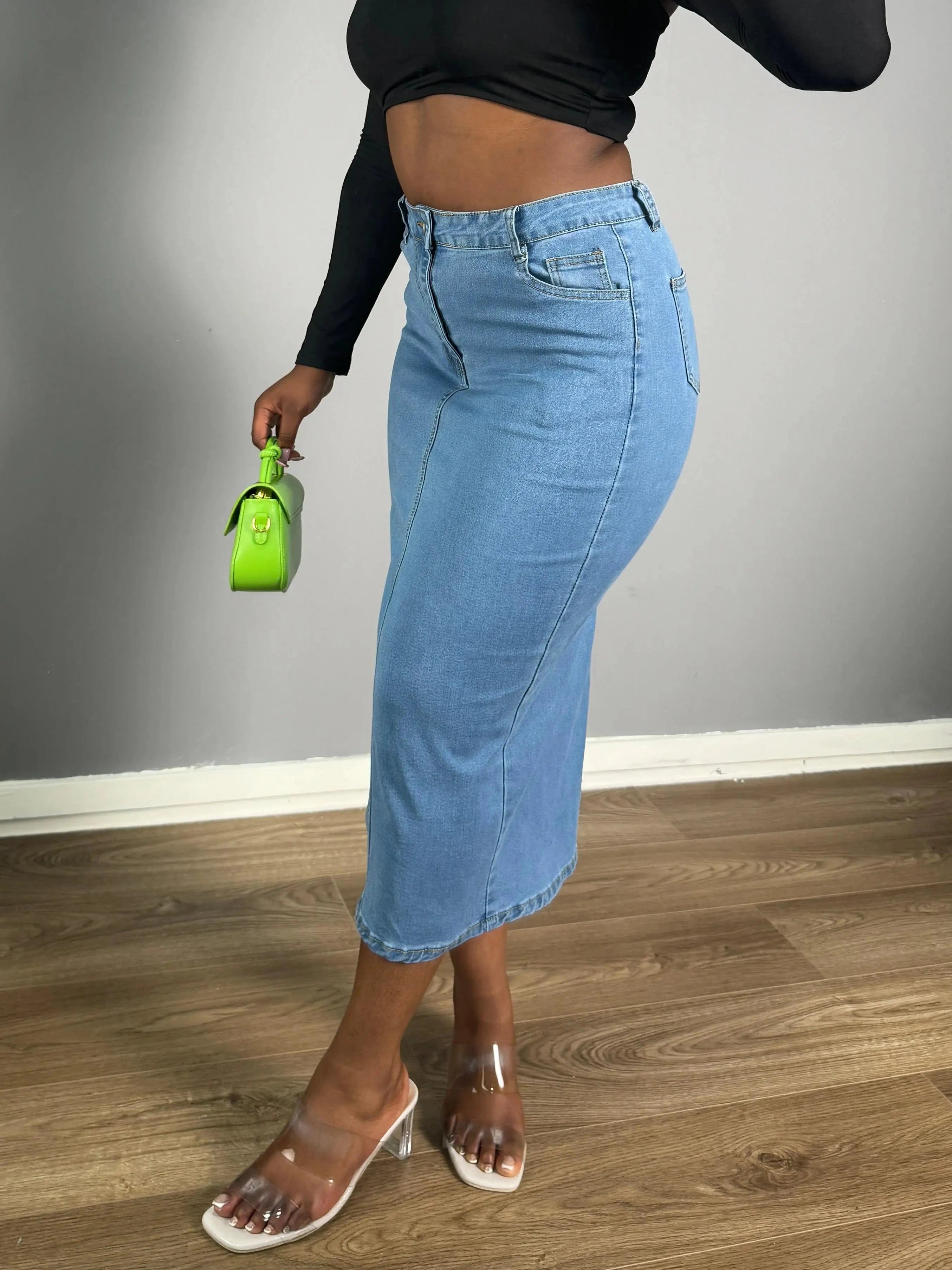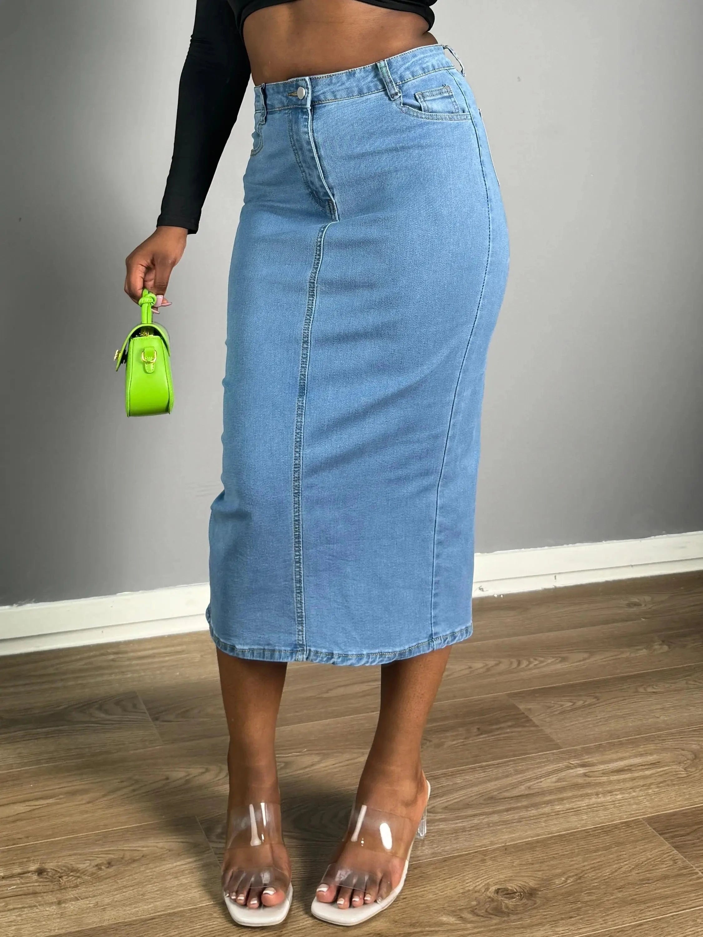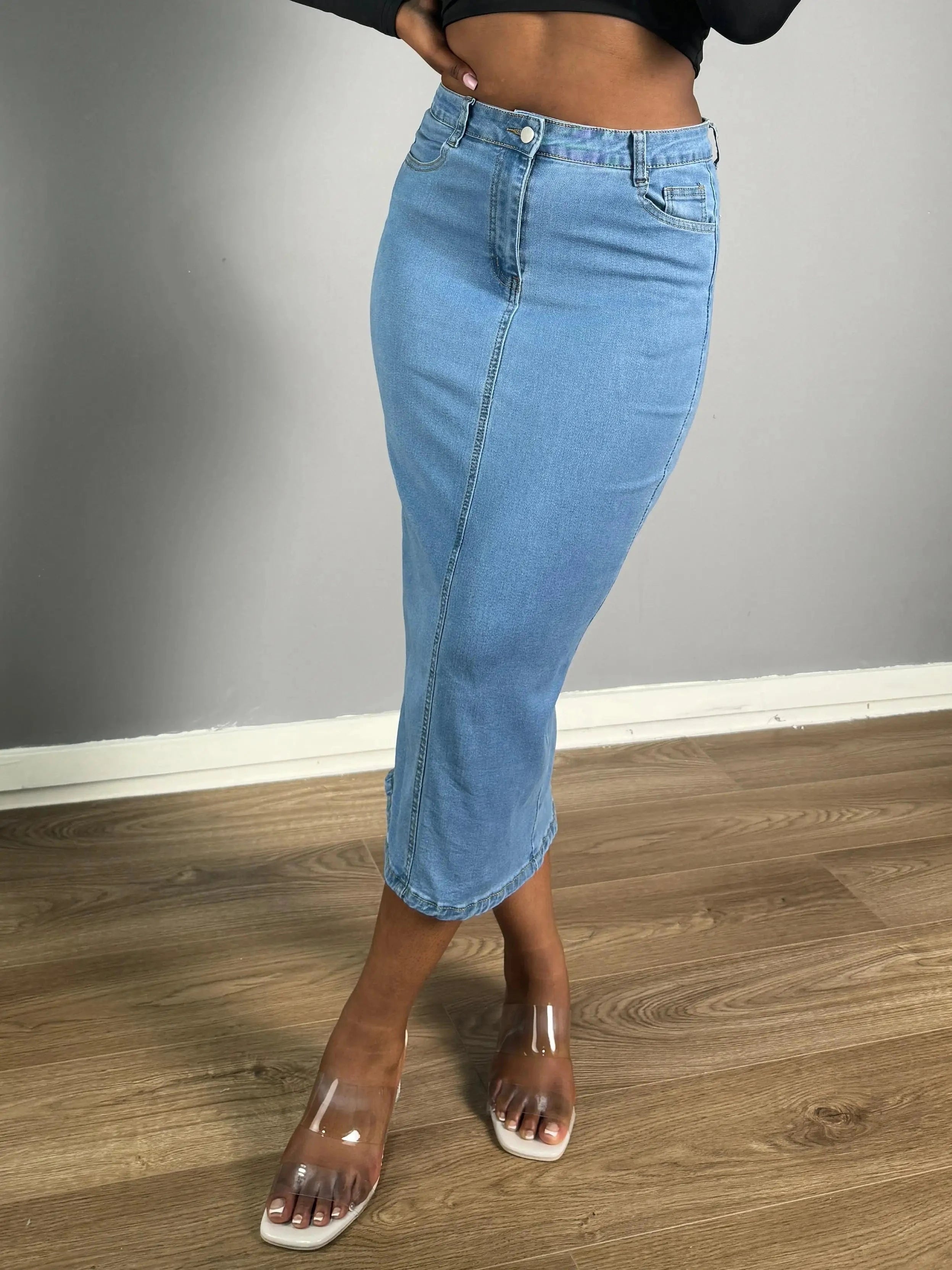 Vår tajta midi jeanskjol kombinerar feminin silhuett med bekväm stretch i ett stilrent snitt som aldrig går ur tiden. Den ljusblå tvätten ger en mjuk och somrig känsla, medan den kroppsnära pennformen framhäver dina former på ett elegant sätt.