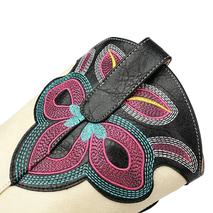 Bohemisk design med unika broderier Fjärilsformade blommönster i kontrastfärger ger varje steg ett konstnärligt uttryck.