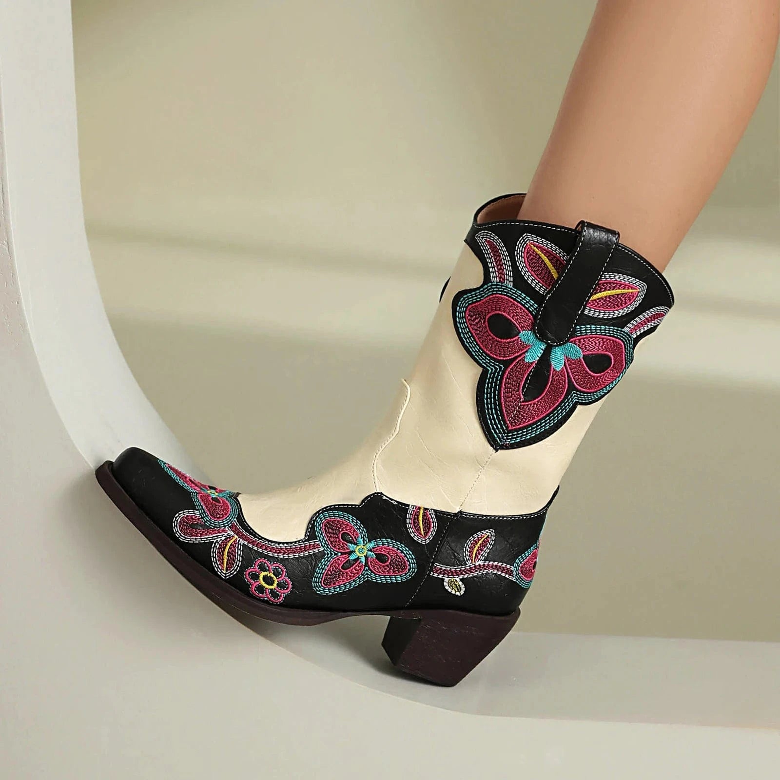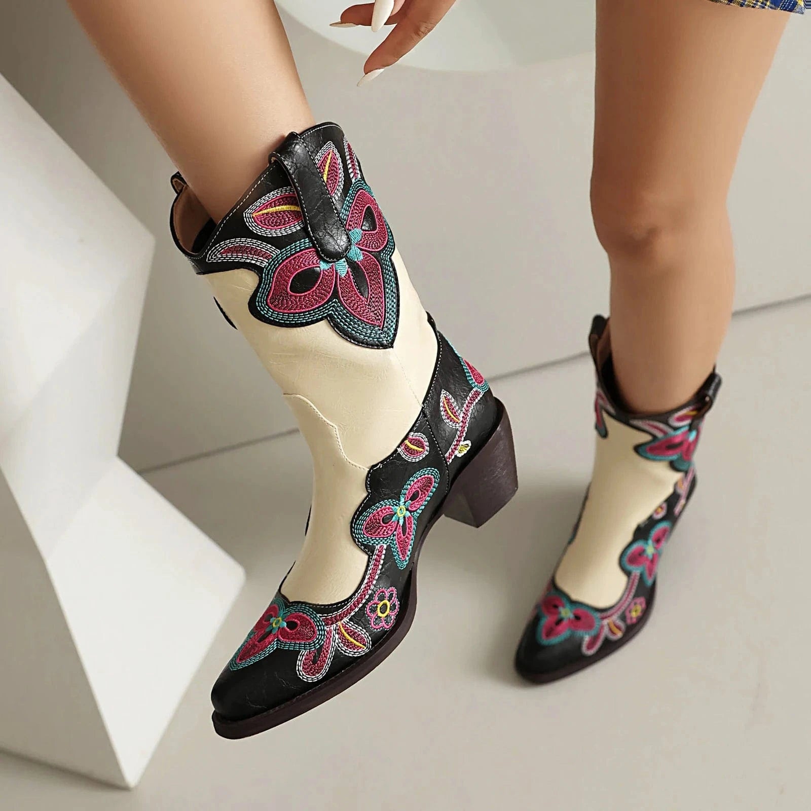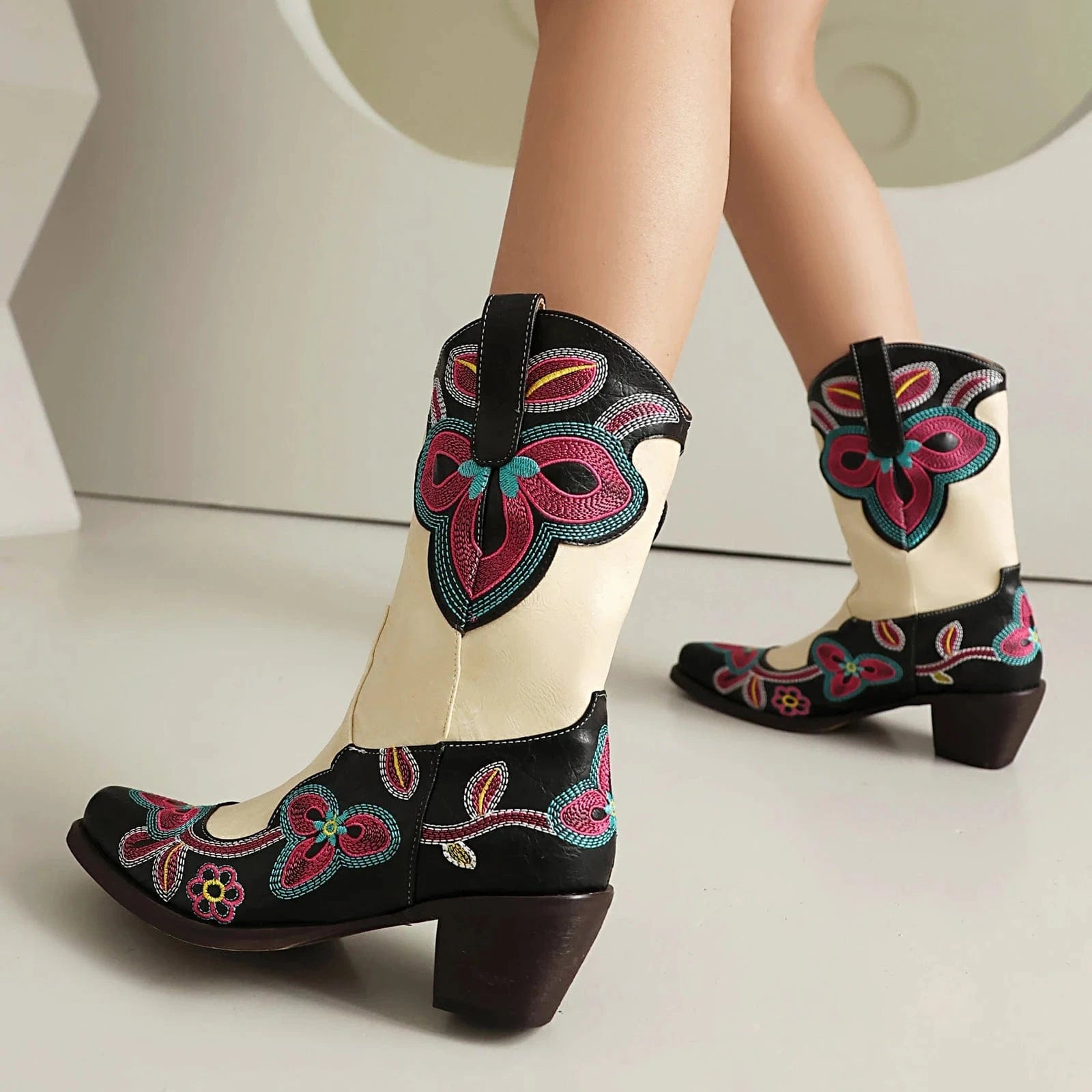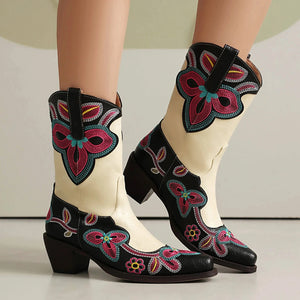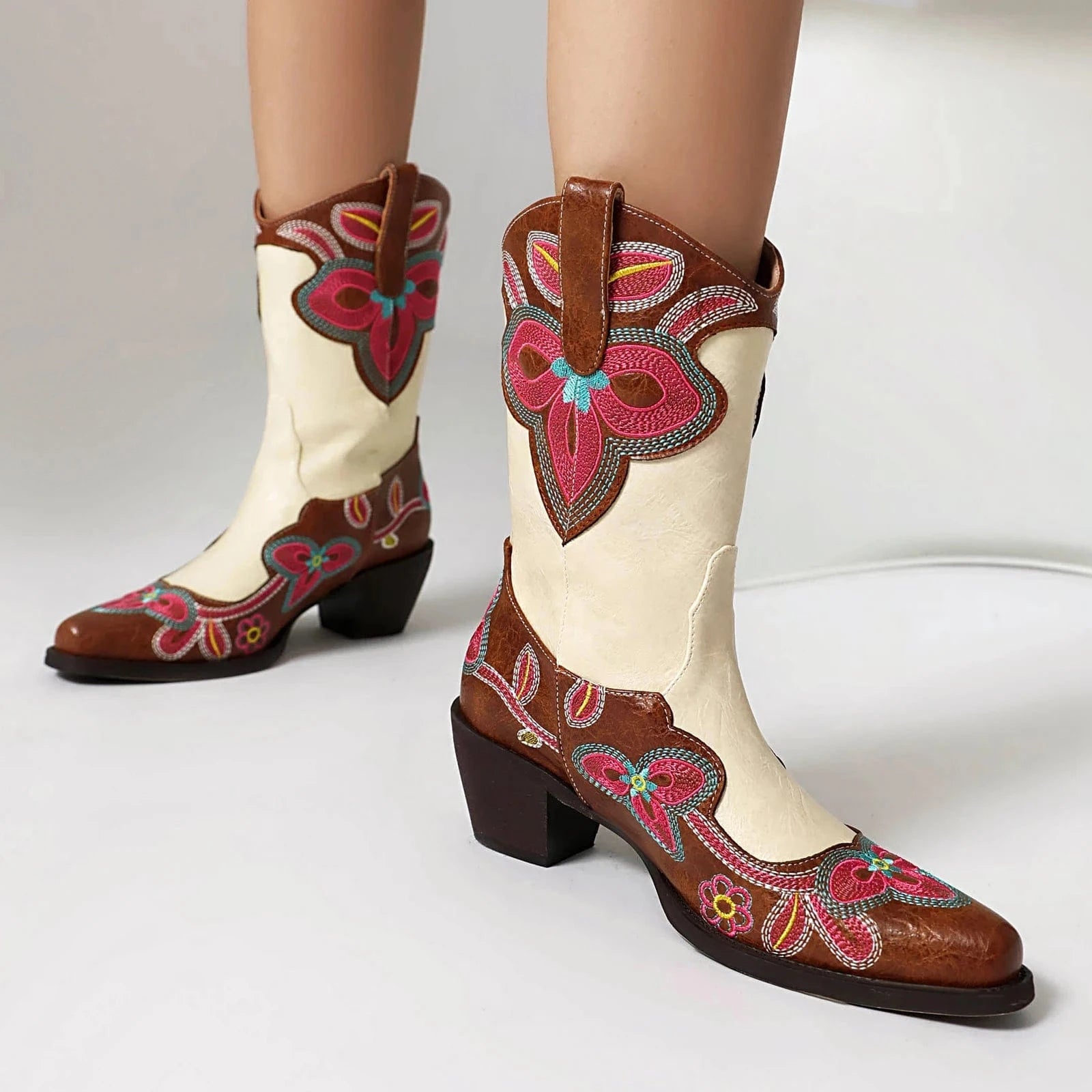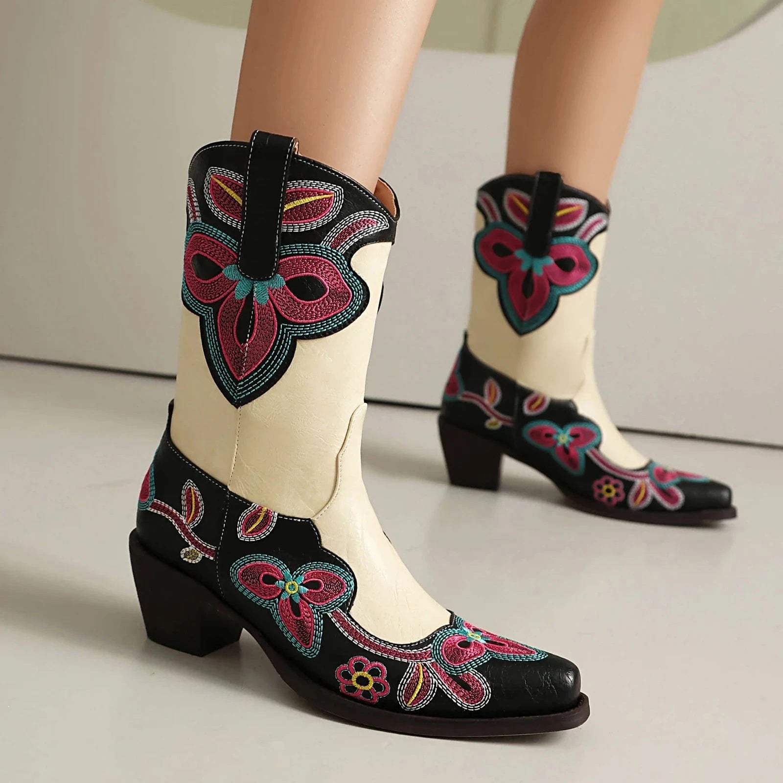 Tvåfärgade Höga Cowboyboots med Blommigt Broderi för Dam