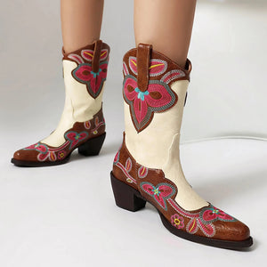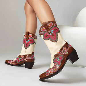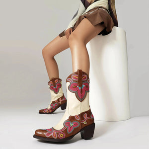 HemTvåfärgade Höga Cowboyboots med Blommigt Broderi för Dam