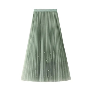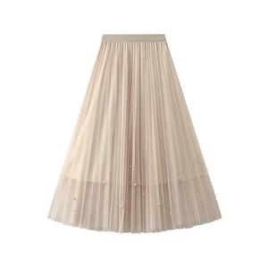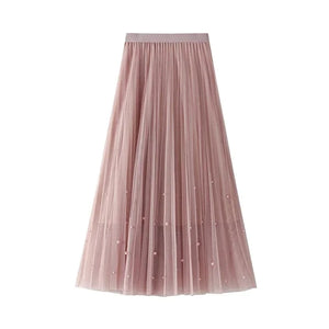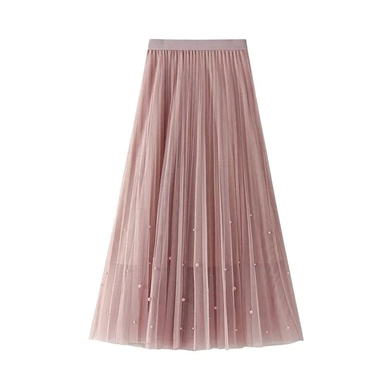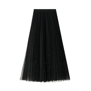 Ge din outfit en subtil men lyxig känsla med denna mjukt fallande tyllkjol, dekorerad med små pärlor som glittrar vid varje steg. En perfekt balans mellan enkel elegans och lekfull detaljrikedom.