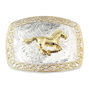 Ett bältesspänne som utstrålar kraft, elegans och tidlös westerntradition. Den skimrande silverytan möter gyllene djurmotiv och en blomstrande gravyr som ger spännet en exklusiv och distinkt karaktär.