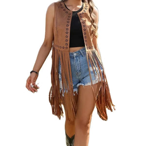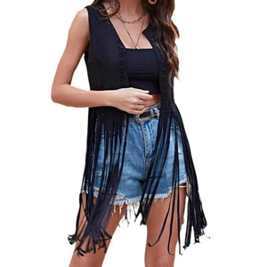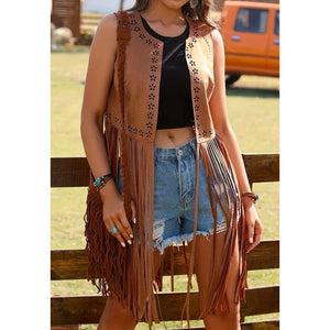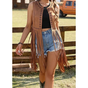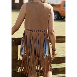 Låt din stil flöda fritt med denna väst med fransar – en perfekt kombination av boho-chic och westerninfluenser. Med sina lekfulla fransar och lätta material ger den din outfit både rörelse och personlighet.