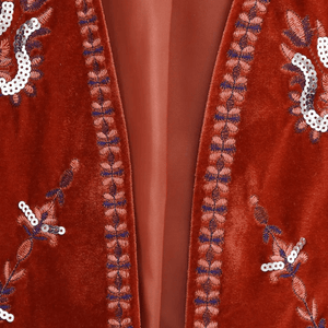 Låt din stil blomstra med denna fantastiska väst i mjuk sammet, dekorerad med gnistrande paljetter och broderier som fångar ljuset vid varje rörelse. Perfekt för att ge din outfit en varm och personlig touch – vare sig du bär den över en blus, klänning eller t-shirt.