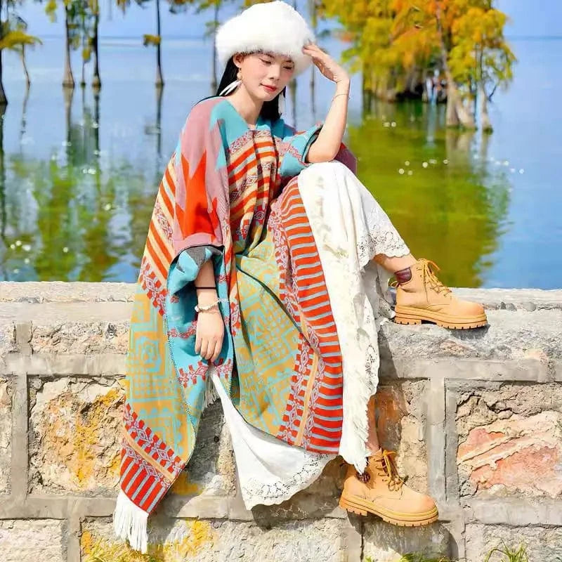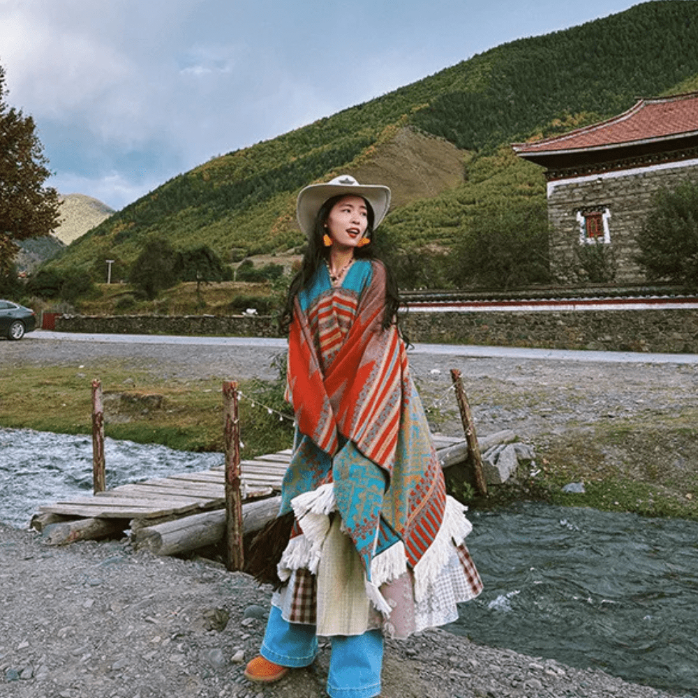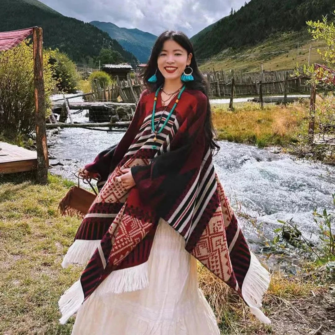 Upptäck en poncho som inte bara värmer – den omfamnar dig med en känsla av vild frihet och westernromantik. Perfekt för kyliga dagar när du vill bära något både praktiskt och elegant.