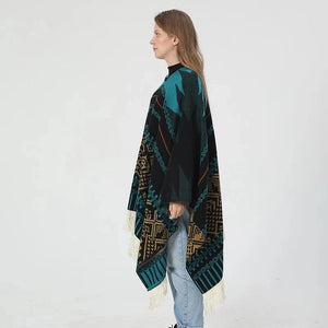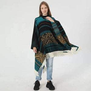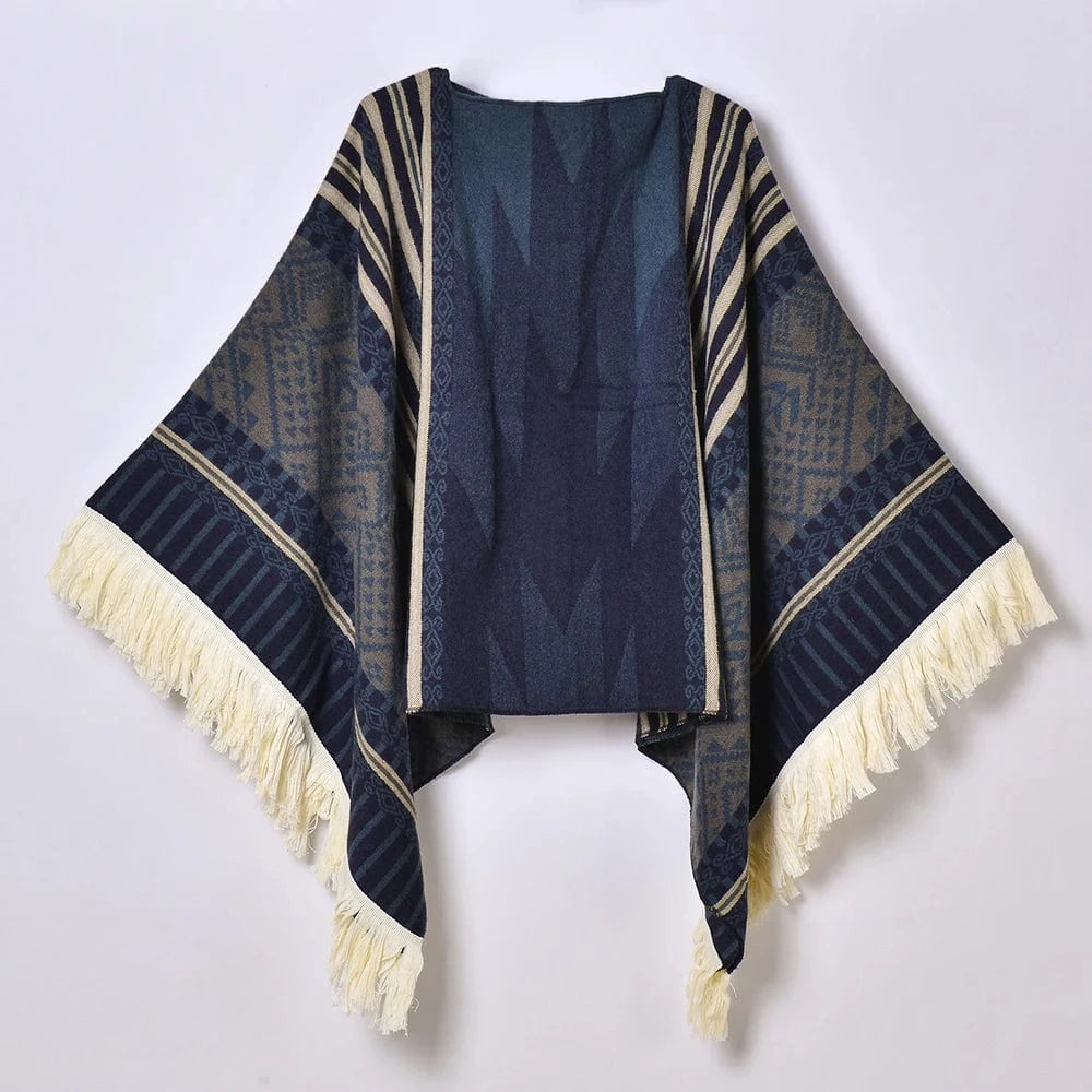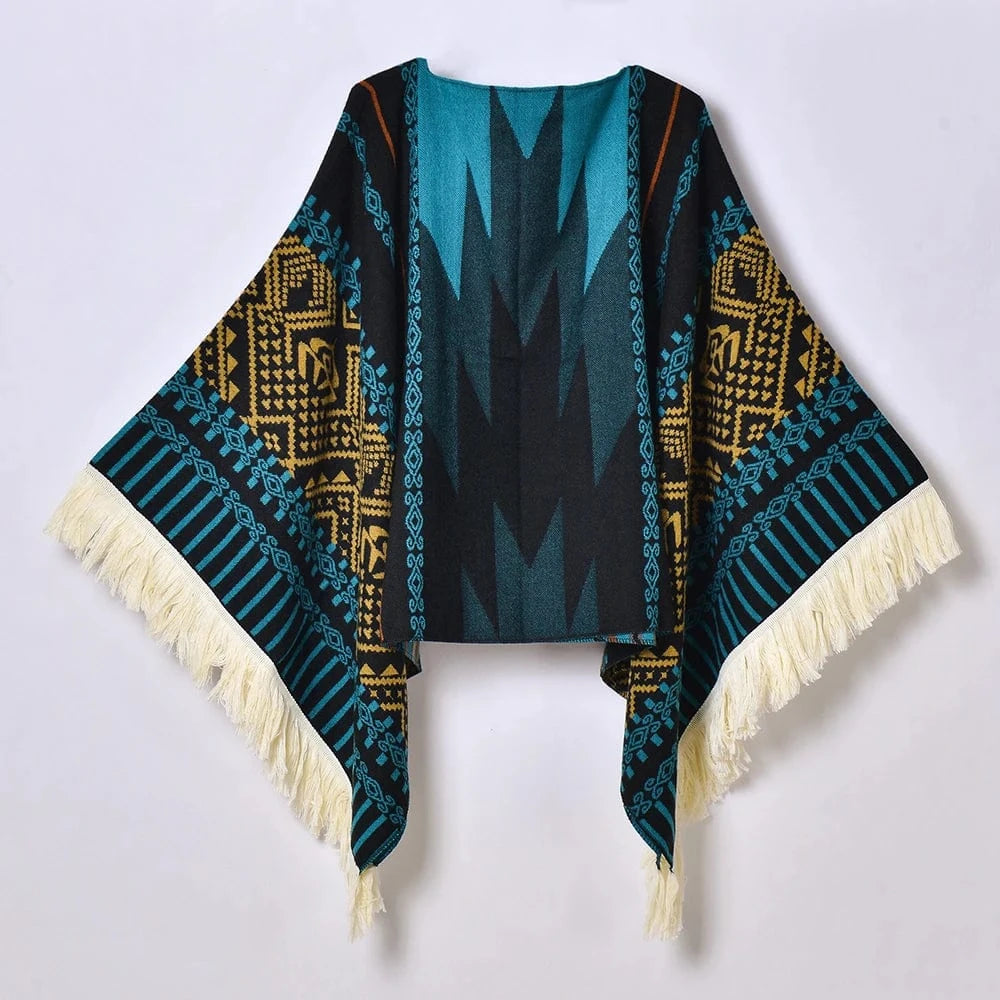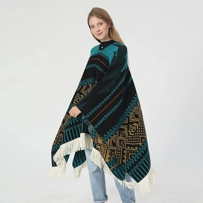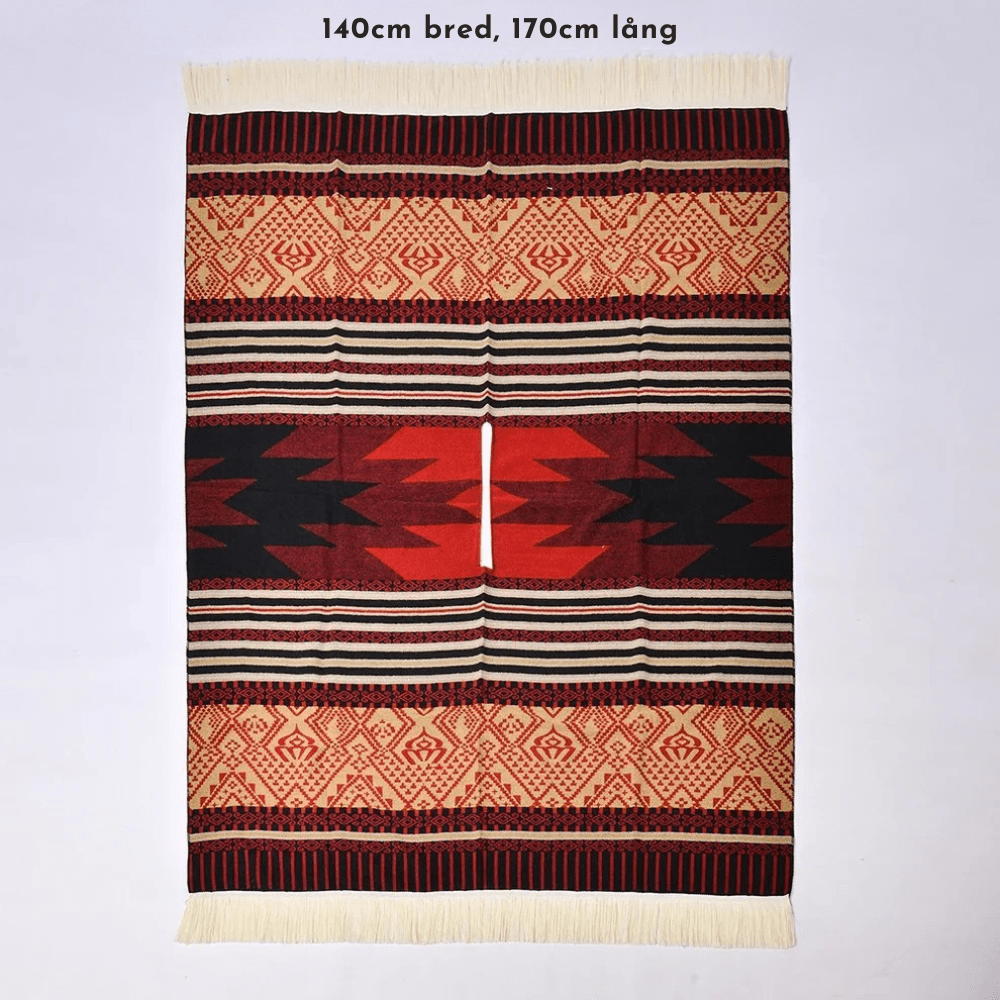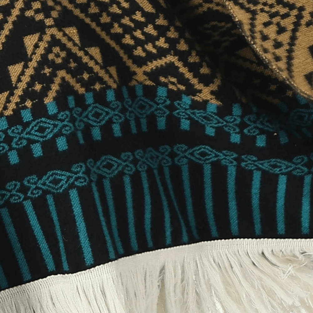 - Stil: Pullover poncho med geometriskt västerndesign