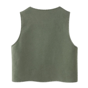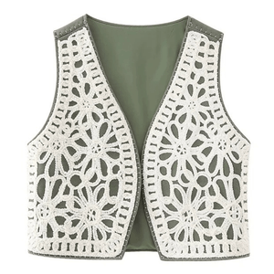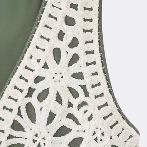 Lyft din sommarstil med en väst som kombinerar romantisk virkning med en fräsch grön bas. Perfekt för festivaler, strandpromenader eller en avslappnad dag i stan – den här västen ger din outfit en touch av både bohemisk frihet och elegans.