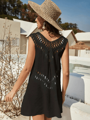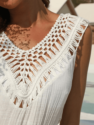 Upptäck den ultimata strandklänningen som kombinerar bohemisk charm med modern elegans. Denna virkade klänning är lätt, luftig och perfekt för varma sommardagar – oavsett om du promenerar längs stranden eller njuter av en drink i solnedgången.